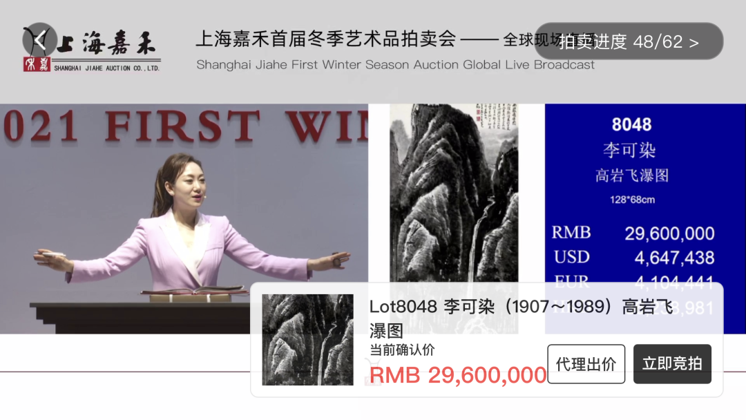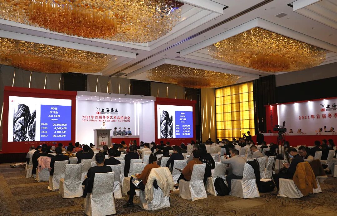 2021年1月1日21:50,在跨年的脚步声中,上海嘉禾首届冬季大型艺术品拍卖会最终以总成交额5.23亿元人民币完满收官!岁暮日短,隆冬愈寒,但依然抵挡不住各地藏友们高涨的热情,现场人气火爆,嘉朋满座。《禾风》中国书画夜场作为上海嘉禾的扛鼎专场,以62件精品、总成交额1.05亿元的战绩辉耀拍场。李可染晚年巅峰之作《高岩飞瀑图》堪为本次的“明星拍品”,历经45轮激烈竞价,最终以3404万元位列此次冬拍成交之冠。程十发《赠郁重今书画合璧巨册》、谢稚柳《柳荫群马图》争夺亦是尤为激烈,分别以1380万元、954.5万元成交,勇夺本场第二、第三高价。此外,《岁月留珍》可以居珍藏书画作品专场中,拍前即倍受关注的傅抱石《抚琴仕女》率先以1495万元高价成交,纵横全场。