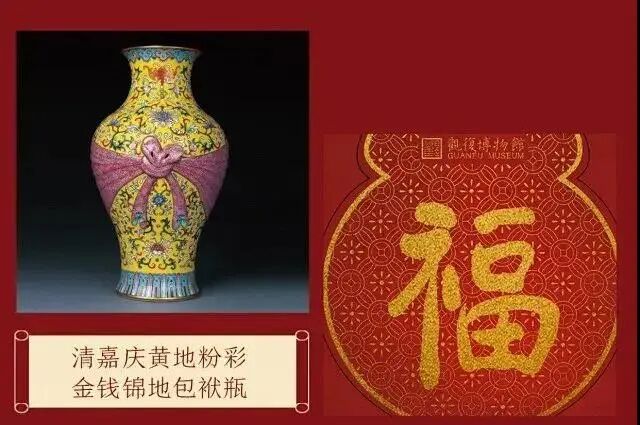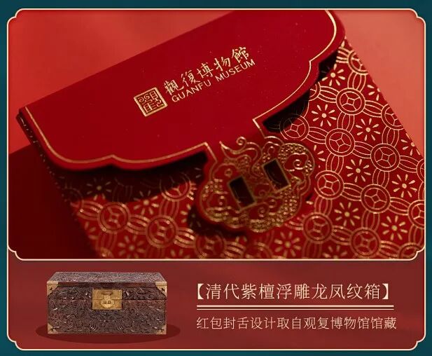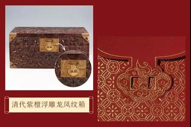 另引馆藏文物【清嘉庆-黄地粉彩金钱锦地包袱瓶】、【清代-紫檀浮雕龙凤纹箱】的经典纹饰,丰富红包整体设计。