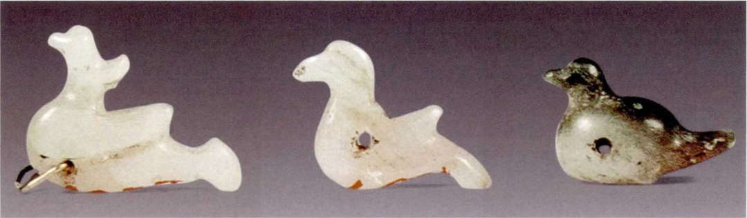 左长1.7、中长1.6、右长1.4cm。白玉,圆雕,器型与北京大葆台汉墓所出玉鸟形坠较为相似,似鸠似鸽,在腹部均有一圆穿孔。左边一鸟还有金圈相连。小巧精致,颇为生动。