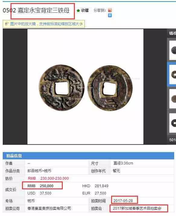 又如:2017年5月28日,在“2017新加坡春季艺术品拍卖会”上,一枚嘉定永宝背“定三”铁母拍得250000。