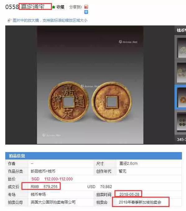 由于嘉定铁钱品种繁多,版别复杂,其中有的还是稀有品,如:2018年5月28日,在“2018春季新加坡拍卖会”上,一枚嘉定通宝拍得579256元。