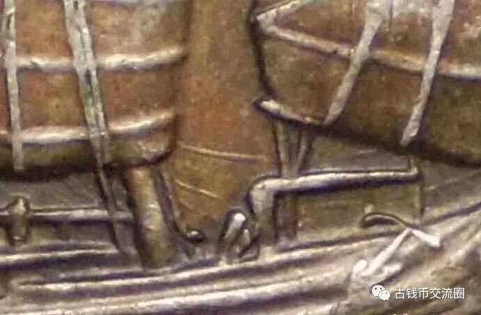 标注4和标注5可以看出,这两条缆绳中间很明显的贴在了桅杆上,但是又只贴了一点点,从前后来看,第123条缆绳是从桅杆后绕过来的,应该不像标注4和标注5给人的感觉缆绳是从桅杆前扯过来的;而且对比普通的二十三年船洋,六绳版在六绳左边似乎还有两条线标注7和标注8,但是都只连接一点点;从图中我们不难推测,这似乎是以老版二十三年为基础,在其间添加了六根缆绳;