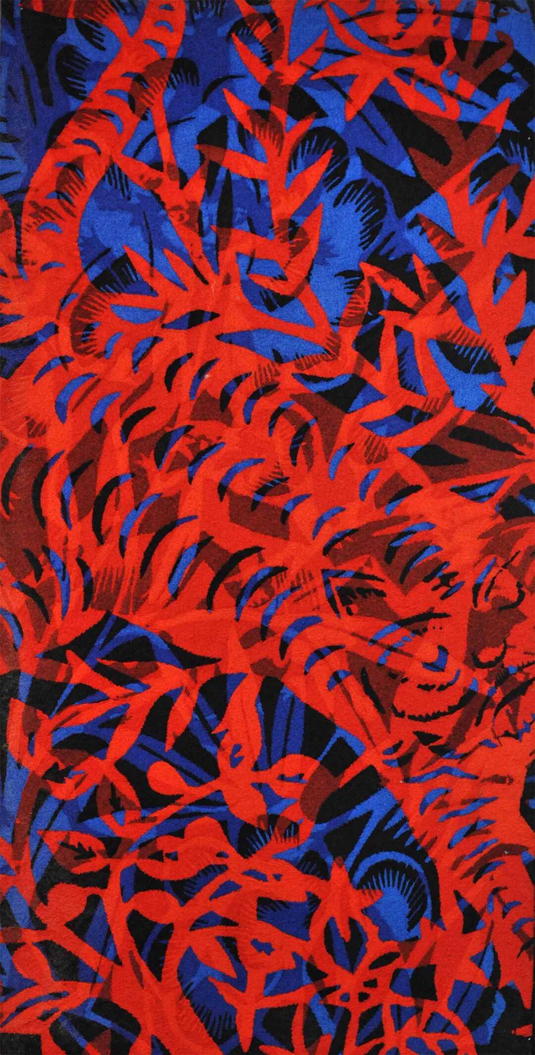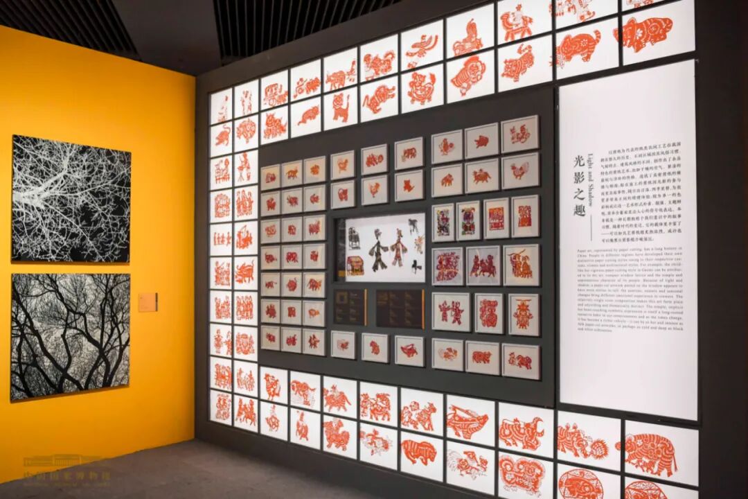 第三单元 追光逐彩。以展品《福虎镇宅》为切入,具体包括展现民间剪纸艺术与潘鲁生“影子”系列作品的“光影之趣”和展现中国传统彩印花布与潘鲁生彩墨作品的“斑斓彩意”两个部分。
