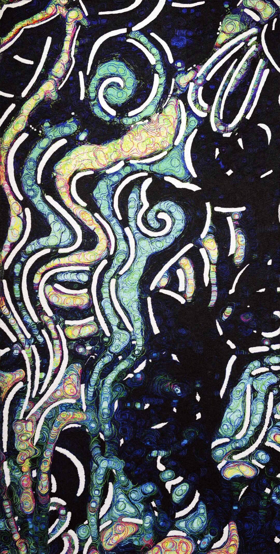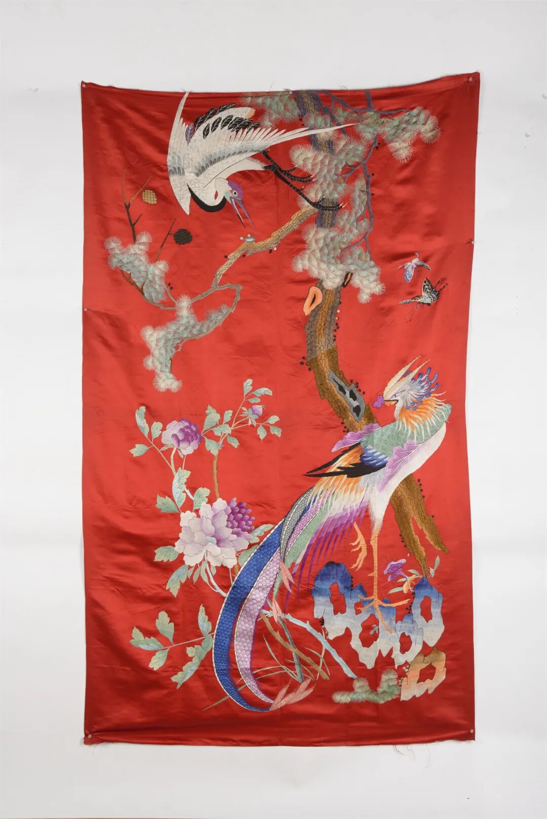 第一单元 采珠撷丝。以展品《百福骈臻》为切入,具体包括展现中国传统民间刺绣工艺及潘鲁生手绣作品的“由点及面”和展现传统纺织工艺与潘鲁生线性作品的“方寸经纬”两个部分。