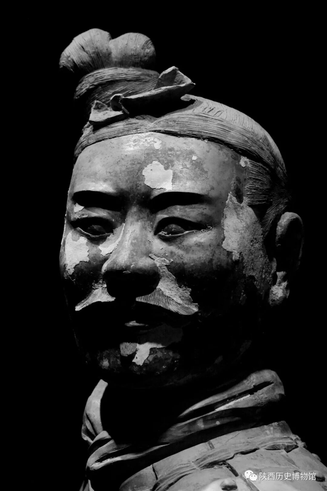 作品阐述:1999年9月,考古人员在秦陵二号陪葬俑坑中发现了绿脸跪射俑,具有相当高的考古价值。俑的脸、颈部均为黄绿色,双耳为浅绿色,头发、发髻为赭石色,发带为朱红色,眉毛、胡须为黑色,眼睛黑白分明,表情自然而神气。金秋十月我有幸参观陕博亲眼目睹镇馆之宝的风采,与之四目相对,仿佛千年时空穿越,一个气宇轩昂的秦人在和我做着无声的交流。本片选择了跪射俑头部特写,采用黑白色系,突出陶俑精神气质。