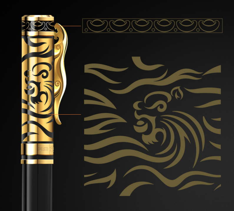 笔帽镌刻“虎咬钱来”图案,霸气侧漏,顶端连环结缀金元宝,更有招财之意,庄重而精美。