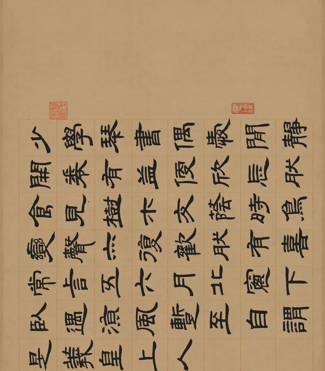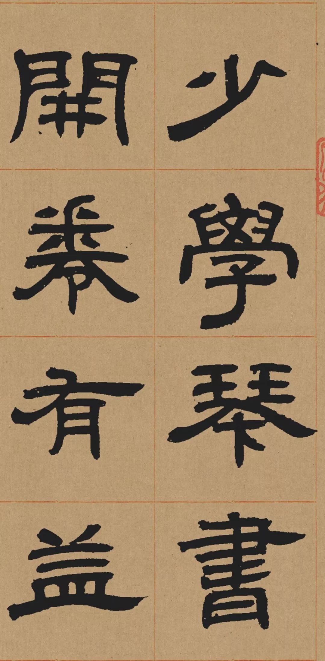 邓石如又是篆刻家,开创皖派中的邓派。他以小篆入印,强调笔意,风格雄浑古朴、刚健婀娜,书法篆刻相辅相成。邓石如的印章有着“疏处可以跑马,密处不使透风”的特色。此帖为邓石如隶书《少学琴书册》。