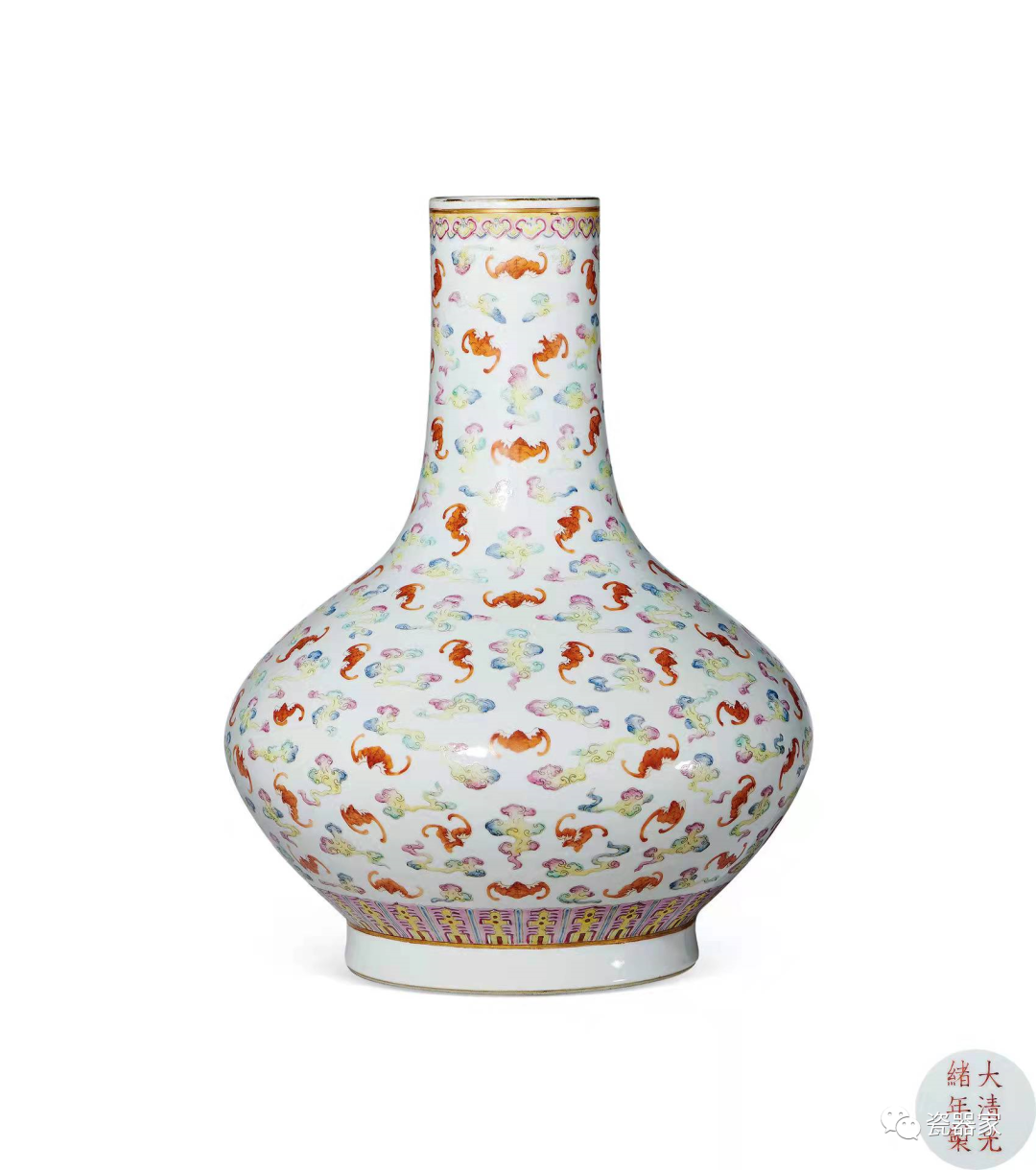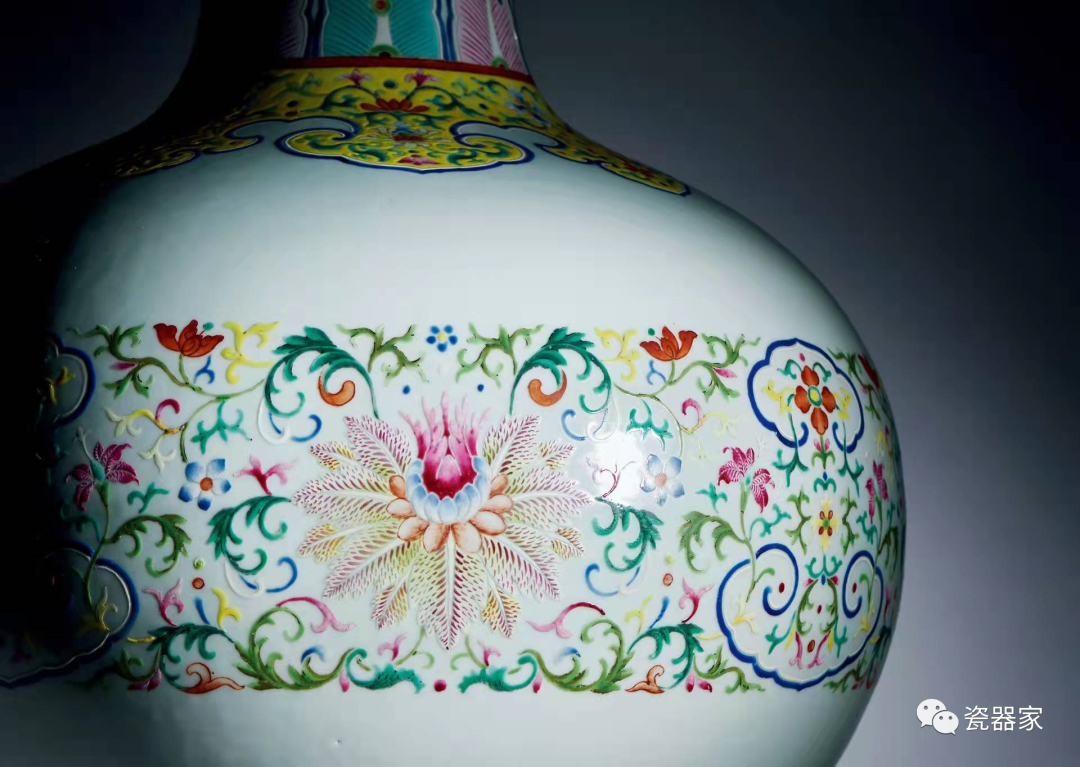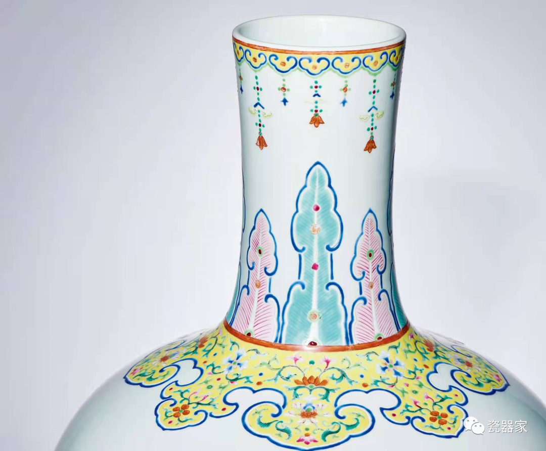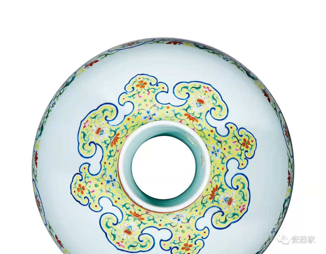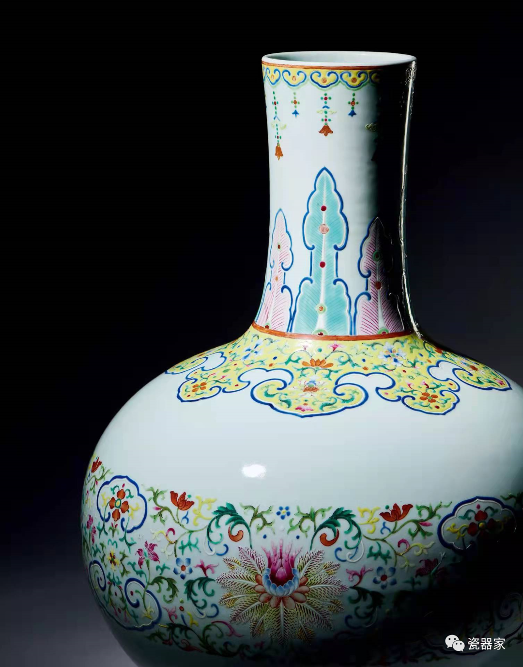 本品为乾隆时期极为特殊的御制彩瓷,形制大气沉稳,于端庄敦实之中透出秀逸之美。其彩绘装饰颇具特色,口沿绘如意云头纹吊饰长短相间的璎珞纹,颈部装饰异体蕉叶纹,源自青铜器,清宫谓之为「蝉纹」,肩部绘八组黄地云肩,分别内绘两类缠枝花卉相间装饰。腹部上下留白,中间绘三组银莲花与西番莲交替装饰,其花卉枝蔓舒卷自如,设色淡雅清新,尤其在莹白色地映衬下更见丽质非凡。足胫处绘饰变体莲瓣纹,底部青花书“大清乾隆年制”六字三行篆款,笔法精湛,神韵甚佳。