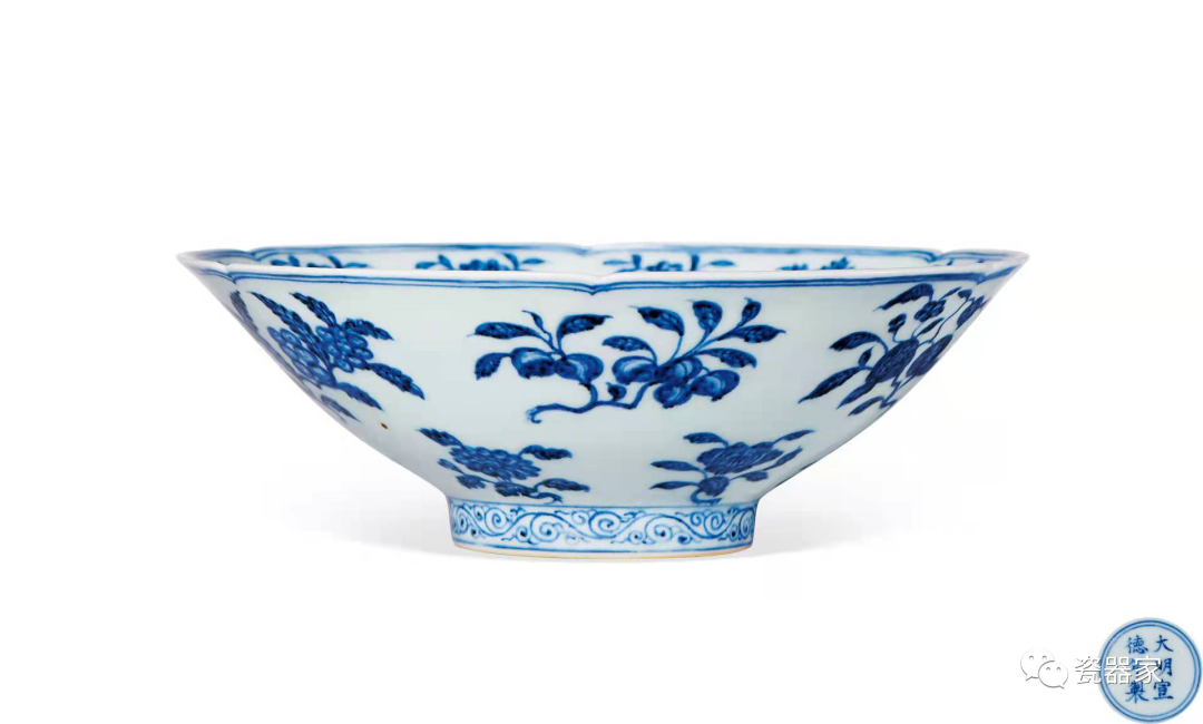 盌侈口,呈六瓣葵花式,斜腹壁,圈足。通体青花纹饰,内口沿下环饰折枝时令花卉一周,盌心内绘折枝桃实,内壁绘折枝莲三株,间以牡丹、菊花、月季各一株。外壁纹饰两层,上层饰折枝桃、荔枝、葡萄、石榴、枇杷、柿子等时令果实,下层饰折枝菊花、茶花、海棠、牡丹、月季、莲花等花卉。足墙饰卷草纹一周。底双圈内书“大明宣德年制”六字双行楷书款。此盌青花发色翠蓝,少有晕染,局部可见重笔点染,发色青黑。胎质细腻坚致,修胎严谨,有质肥厚莹润,胎秞结合紧致。因器型似倒扣的斗笠,故名斗笠盌。
