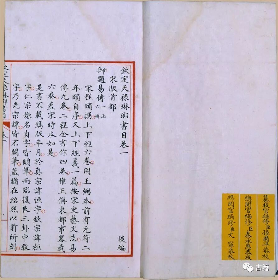 乾隆年间编的《天禄琳琅书目》,并非一般意义上的书目,它实为清代宫中所藏善本书志,它和《四库全书总目》最大的不同,就在于它是典型的注重版本著录的“书目”。王先谦跋《天禄琳琅书目》云:“复命辑《后编》二十卷,书都一千六十三部,自宋迄明,五朝旧籍咸备,旁罗远绍,既大极无外,而于刊印流传之时地,鉴赏采择之源流,并收藏家生平事略,图记真伪,研讨弗遗,尤细破无内。于版本严择广收,而明代影宋钞本并从甄录。”