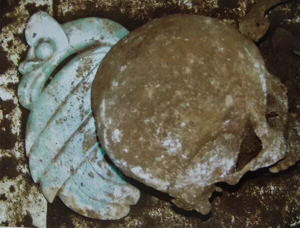 女神像残体,眼睛是绿松石做的。好大一个嘴,张着的。本博以为,这与巨口兽形佩相吻合,可能是风婆婆,风后?而且,她可能是有翅膀的。