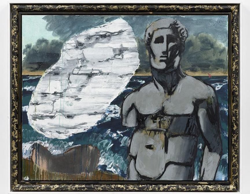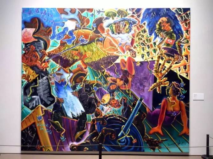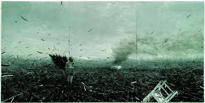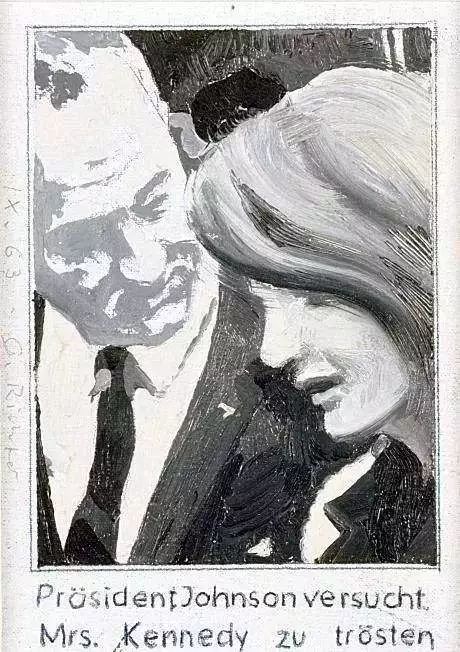 伊门多夫最著名的作品是《德国咖啡馆》系列。他从1977年开始到80年代一直在创作这组油画。每一幅画面的背景都是像夜总会一样喧闹,画面色彩明亮、充满了象征性符号,令人产生晕眩感,其中的主要人物有东西德的领导者、剧作家和戏剧人物。伊门多夫把想象中的咖啡馆建筑在东西德的边界上,仿佛冷战政治下的滑稽剧场,每天上演着以各种托词争夺国家的身份和文化遗产的闹剧。在1984年的《德国咖啡馆》中,伊门多夫已经预测到了德国的统一。在画面左边,四匹神马拉着象征德意志统一的勃兰登堡门冲进酒吧、打破了所有坚冰一般的隔断和屏障。画面的右边,希特勒似乎从坟墓中升起,正无力地眺望未来。他那些深入地下的魔爪、毒牙终于被连根拔起。在一张颠倒了的咖啡桌前,画家正悠闲地看着这一切,仿佛是这一幕戏剧的导演。 这件作品是在一个高两米见方的白色背景上,以黑色大写字母拼出来自导演弗朗西斯·福特·科波拉的电影《现代启示录》里的一句话: SELL THE HOUSE SELL THE CAR SELL THE KE3S (卖房子卖车卖孩子)。这件作品在25年间价格上涨至最初价格的3500倍 引起广泛热议。《现代启示录》反映出当代艺术市场史无前例的兴起及其背后的种种势力,作为一件脱胎于纽约下城街头涂鸦的前卫风格作品,《现代启示录》从纳粹时期的德国逃亡到法国的难民,到亿万富翁弗朗索瓦·皮诺,前后六次易手。其中一位藏家曾经把它挂在杰奎琳·肯尼迪·奥纳西斯童年时在公园大道的住宅里,可见其魅力所在。在2017年第57届威尼斯双年展上,由安妮·伊姆霍夫创作的《浮士德》为德国馆国家家馆赢得了金狮奖。这是一个伴随着金属音乐的、长达5小时群体行为表演作品,从视觉呈现到即兴演唱,多重形式相互重叠。作为创作者和导演,伊姆霍夫允许表演者自由表达,即兴发挥,表现身体的扭曲和对抗。这件作品的玻璃结构类似于培根作品的透明框架。伊姆霍夫用透明玻璃板把地面垫高,把空间分割开来,突出了玻璃的硬度和脆弱,透明性、流动感、冰冷感和脆弱的潜在危险,同时也分割出内与外、上与下的边界,表现了一种隔离的冷酷。这种冷酷也同样反映在面无表情的表演者和相互拥挤的观看者身上。所有的表演都在玻璃隔板上进行,观众在透明的平台下面,紧张地看着表演者,而表演者并不与观众对视或对话。在观众眼中、手机镜头中和媒体的再现中,表演者的身体仿佛是所规训的机器,被看不见的结构所限定的材料,被不断复制的消费图像和数码产品。1963年,里希特画了一幅有明显政治内容的照片画《约翰逊总统安慰肯尼迪夫人》。图像源自于著名摄影师斯托顿拍摄的一组新闻照片,记录了1963年11月22日,肯尼迪总统在达拉斯遇刺身亡后,副总统约翰逊赶到达拉斯机场,在空军一号总统专机的机舱里宣誓就职的场面。照片上,杰奎琳低着头,头发遮住了大半个脸,没人看得清她的面部表情。这样一张照片既不是煽情的图片,也不仅仅是历史性的记录,而且隐藏着意识形态的重要信息。里希特的画看似轻描淡写,突出了笔触,弱化了人物的轮廓,特别是画面的下方,新总统和前第一夫人的身体隐没在一大块模糊的灰黑色之中。在那个写实代表苏维埃体系,抽象代表西方资本主义的时代,里希特用模糊的写实柔化了现实,以抽象的再现反对抽象的形式,有意识地消解了其中的固定含义。正如麦克卢汉在1964年所指出的:冷战是一场信息与图像的电子战斗。在这张时事照片上,杰奎琳出现在新总统的就职仪式上的重要意义在于:向世界显示出美国权力交替的秩序感和延续性。马丁·基彭伯格经常把平凡琐碎的日常生活画得像历史题材一样重要。政治、媒体和广告都能随时给他带来启发。《纽约天际线》(NYZRA)这幅作品由四个部分组合而成,中间形成的空隙呈十字型,仿佛为纽约的风景加上了一道永久的十字架。画面破碎的结构和阴暗的色彩打破了人们对纽约高楼大厦的浪漫遐想。画面中间的硅胶构成黑色铁丝网的样子,更增加了图像的戏剧性和脆弱感。画于80年代中期,冷战结束的时代,这幅画解构了纽约作为西方资本主义权力象征的神话。波尔克的代表作《兔女郎》描绘了一群《花花公子》杂志上常见的女模特。远看她们与广告杂志中的性感女郎没有什么不同,但是近看会发现,她们的面部细节夸张变形,如同怪物的一般。波尔克用这种方式嘲笑了拜物主义,揭示了商业图像对人的物化。关注公众号:老货圈。当这个图像被放大呈现时,会令观众感到不适,并迫使他们重新审视自己习以为常的观看方式。在《尤利西斯》系列(2011-2012)中,吕佩尔兹把希腊神话中背井离乡的英雄描绘成了一个被遗弃的古典雕像,尤利西斯的眼神空洞,象是在沉思。他的身体强壮,有着轮廓清晰的面孔,却象米罗的维纳斯一样只有一只断臂,而且垂在身体下方。在他的身旁,是丢弃在一旁的钢盔、行装或船,背后是破碎的山川、树木与大海和再也回不去的故土家园。这种带有超现实主义的图像展现出来的不是古典的田园牧歌,也不是怀旧的乡愁,而是一种反英雄主义、反唯美主义的存在主义立场。