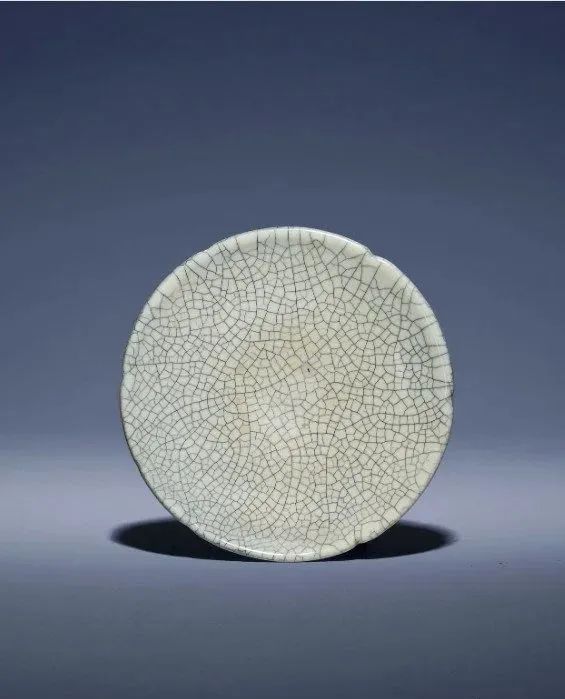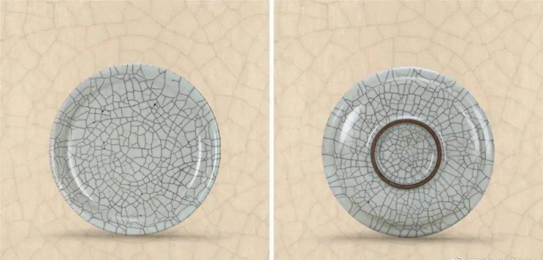 此件哥窑盘,折沿口,平腹,浅圈足,通体施灰青色釉,满布鱼子纹开片,古称之为“百圾碎”,乃宋代哥窑之尚品佳器。圈足露胎,呈铁锈色,釉肥厚而微露紫口效果。然宋哥之铁足特征极为显著。整体古朴之极,釉色纯若古玉,若配以灯光,仿佛一件古代玉盘。宋人尚玉,信奉儒教,常拜孔子。子曰:“夫玉者,君子比德焉”。意指夫子常以古玉比喻君子,以古玉之德来喻君子之德,故制瓷亦仿玉之效果。五大名窑之中,又以汝、官、哥三窑,突显宋器之美,古时文人君子,视若至宝。