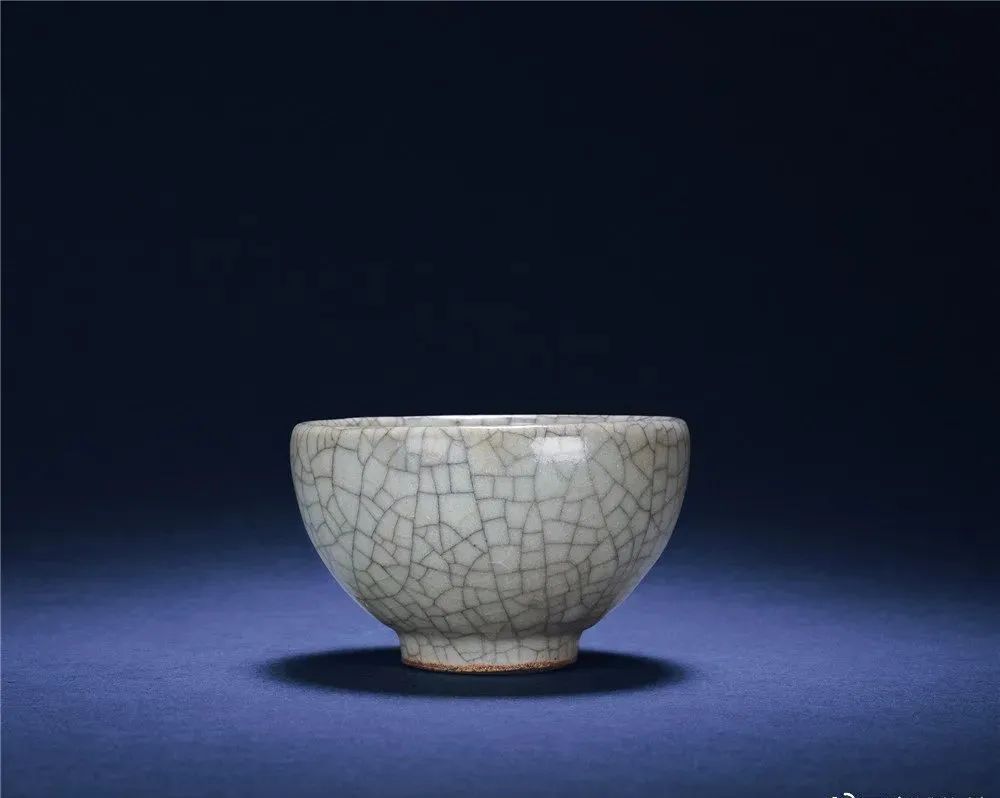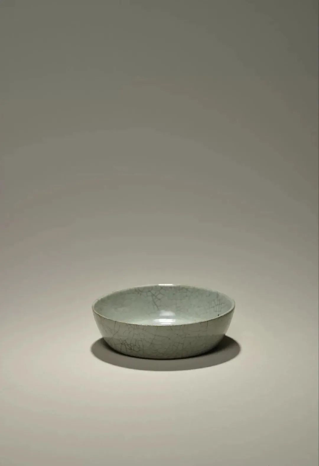 哥窑之瓷,自烧成起,已见时人撰文赞之,证故时匠人神技巧思,尽谙美瓷韵,出窑成品时,溢散赵宋文士雅调。观此盏釉色略偏粉青,昔日匠人定缓缓迭施釉层,甚或重复窑烧,始达如此柔光婉约之效。裹之厚釉,锐角敛藏,婉柔之处,让人爱不释手。遥想当时烧成出窑以后,冷却工夫掌握得宜,继而润其色,方得如此铁线开片,疏朗自然,彷佛琼玉整块琢成。胎土黝色,唯足可见。黑褐,悄使色增层次、形添沉稳。