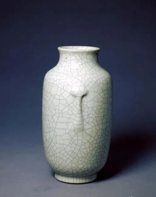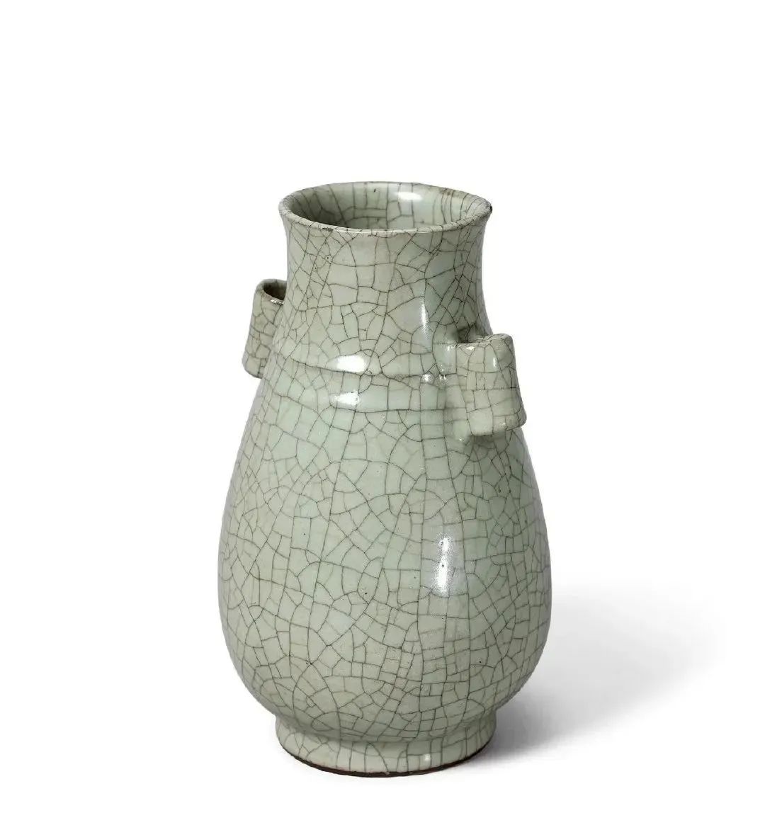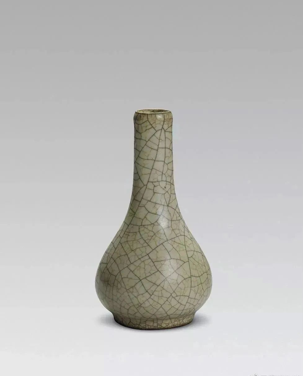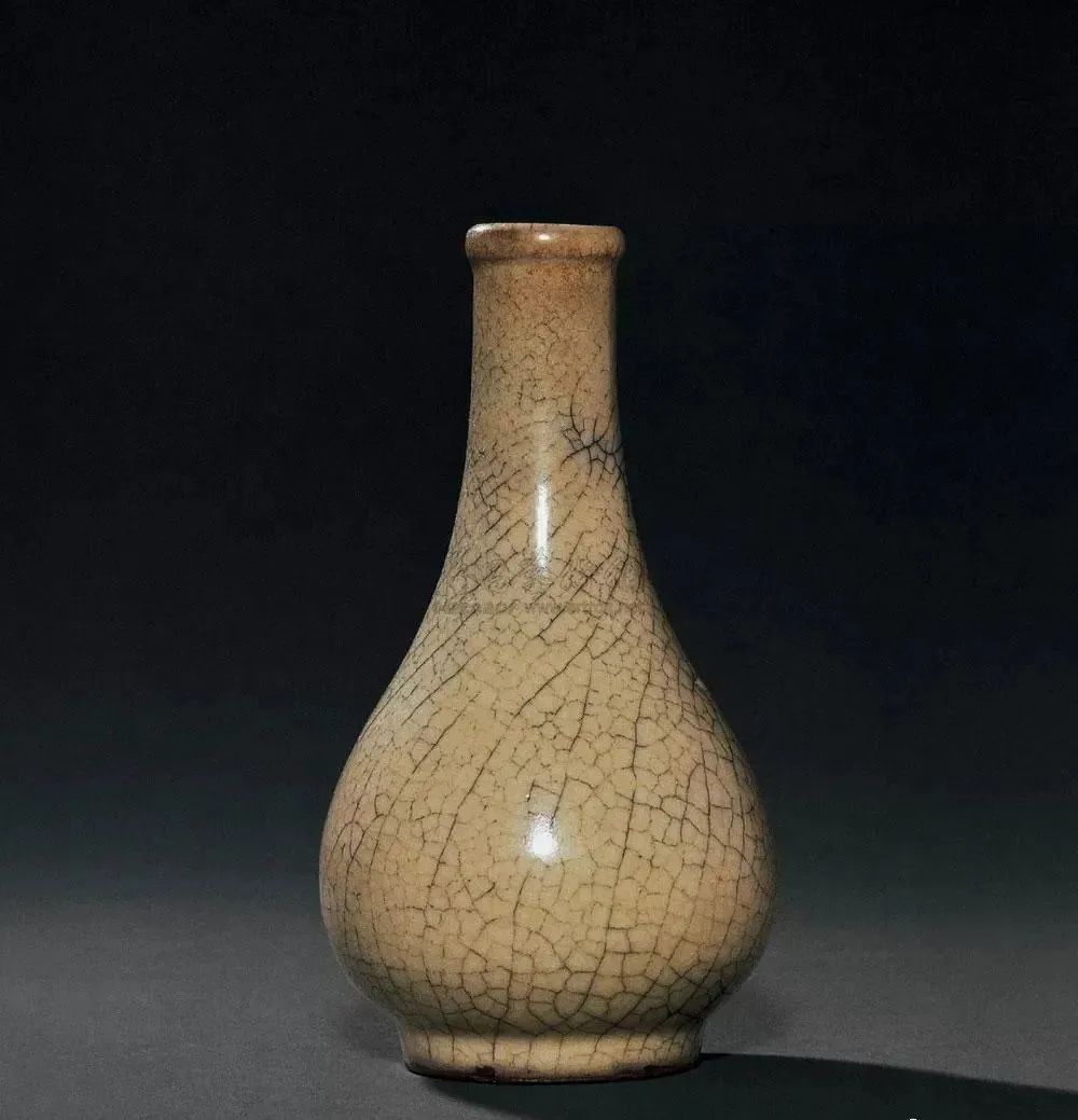 本品仿铜壶造型,颈部凸起二道弦纹,肩部两侧各有管状贯耳,色泽米黄,周身纹片致密,深者呈紫褐色,浅者则为金黄色,大小纹片相间,深浅两色交织,遂成典雅美观的“金丝铁线”。足端施釉不甚整齐,胎色深褐,益见古拙之气,亦正是高濂《遵生八笺》、文震亨《长物志》所追求的“堂中插花”所用“哥窑瓶”。哥窑之所以见灰青和米黄二色,其实釉料配方应无大异,更多原因在于烧造后期还原程度所致,还原充分者为灰青,还原不充分者则为米黄,各见雅韵。