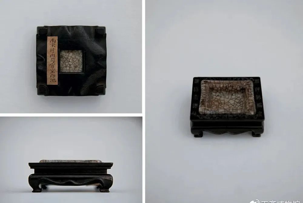 哥窑方印池,敞口折沿,平底卧足,采用裹足支烧的冶陶工艺,底有四枚小支钉痕。通体施灰青釉,釉面开大小不同的纹片。大纹片多呈黑色,犹如铁线,小纹路细浅,呈黄色,恰似金丝,纹片大小交织,浅深相间,犹如金丝铁线附于印池之上。器底外角略脱釉露胎成铁褐色,支钉断开处亦为褐色。釉面厚润如堆脂,闪烁油光,于细腻平滑中透露着古朴典雅的美感。