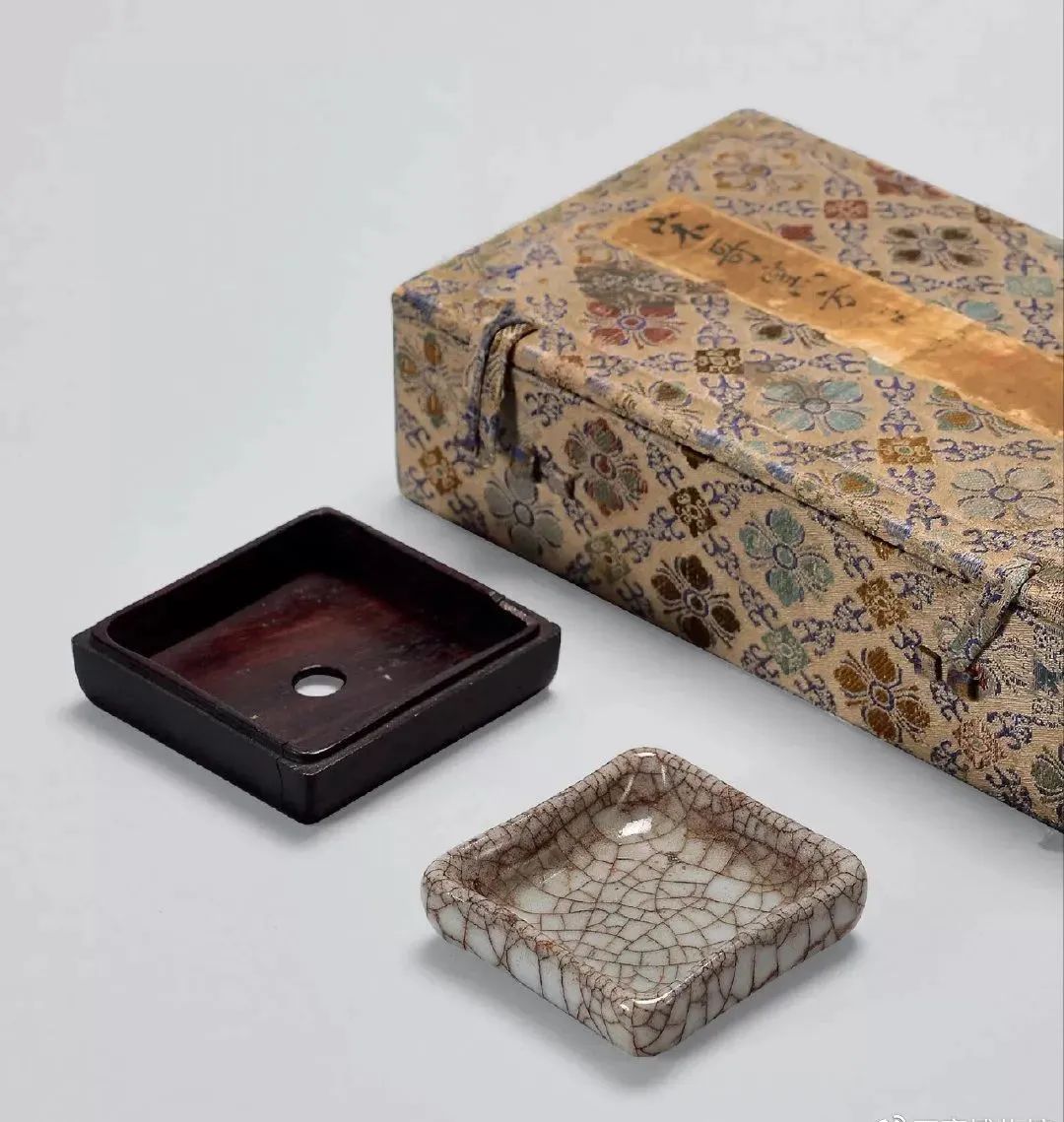 此件仿哥釉小洗,四方型,直口,浅腹,四方底。通体满施仿哥釉,釉层肥厚,釉色莹润,开片自然,错落有致,淡雅隽永,厚润古朴,颇得宋器遗韵,此水洗制式,与台北故宫博物院收藏南宋、元米色青瓷文房器相似,可见《得佳趣-乾隆皇帝的陶瓷品味》(台北故宫博物院,页134,图46)。此件拍品形制规整,中心微凹,兼具实用与观赏性,通体施以仿哥釉,釉质肥厚,开片自然交错,形如冰裂。为一件难得的文房雅器。哥釉洗是文房用器中的名品,数百年来备受文人雅士们的赞赏。此器造型端庄古朴,周身纹片致密,所敷施釉色厚润犹如凝脂,宝光内蕴,实为难得之哥釉经典传世品,原配木质底座及锦盒,更显古朴高雅之美。
