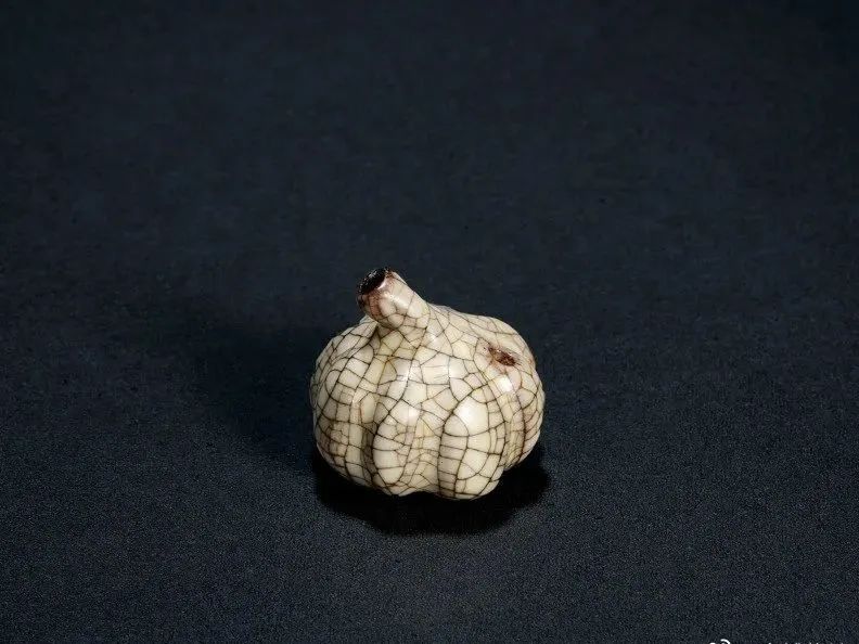 此哥窑水滴作仿生蒜头形,多瓣形身,上以蒜头为流以出水,中部置一小口以注水,平足内倭,垫饼支烧露棕黑色胎骨。外满施月白色灰青釉,釉面厚润犹如凝脂,如冰似玉,宝光内蕴。口沿由于釉水流淌,釉层较薄,略呈紫色,底足露棕黑色铁胎,正所谓“紫口铁足”。周身纹片致密,静穆古雅,深者呈紫黑色,浅者则为金黄色,大小纹片相间,深浅两色交织,遂成典雅美观的“金丝铁线”,为南宋哥窑最典型之特征。