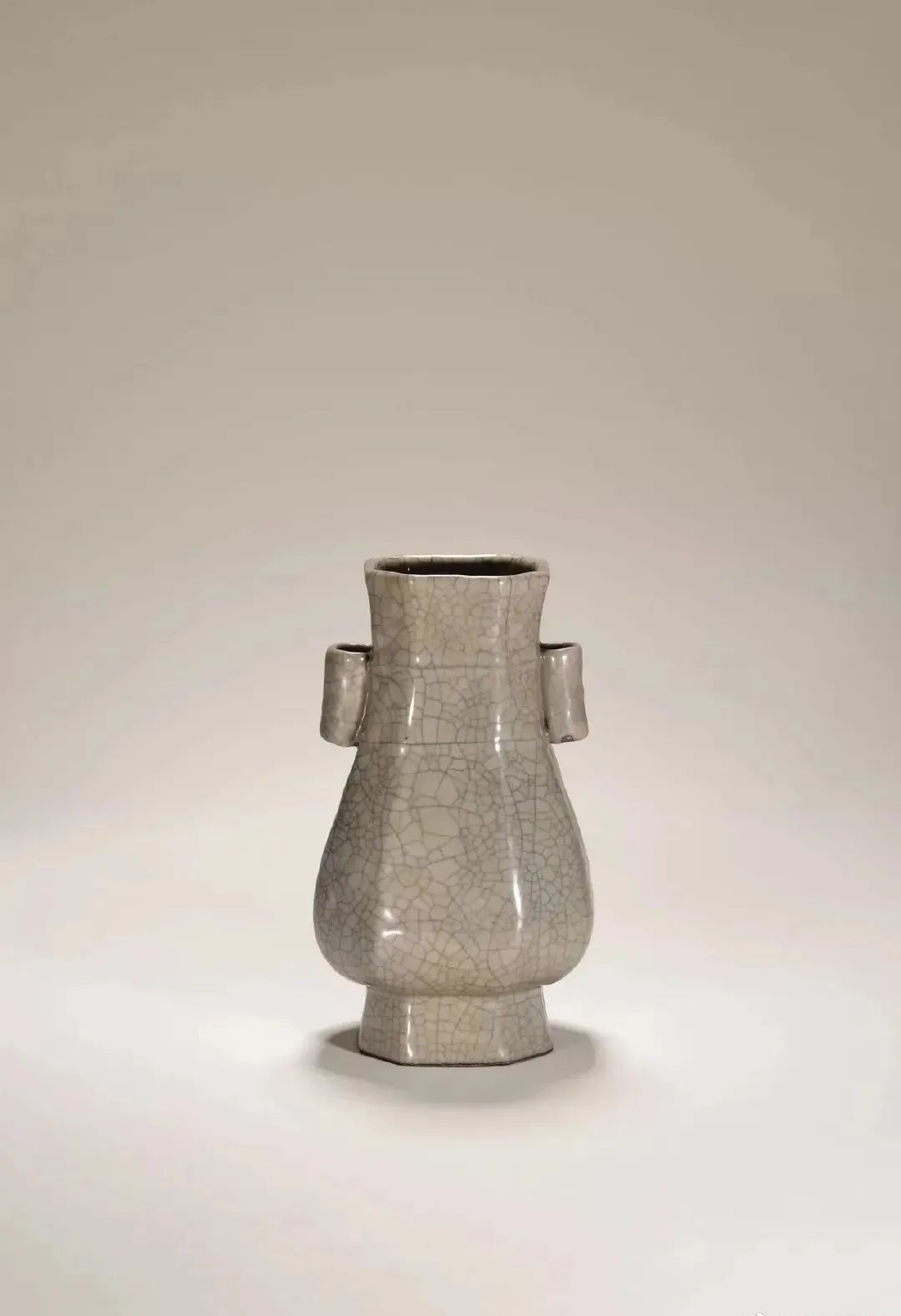 本品仿铜壶造型,作八棱形,气韵硬朗,刚阳古朴,颈部凸起二道弦纹,肩部两侧各有管状贯耳,所敷施釉色厚润犹如凝脂,色泽米黄,宝光内蕴,周身纹片致密,深者呈紫褐色,浅者则为金黄色,大小纹片相间,深浅两色交织,遂成典雅美观的“金丝铁线”。缩釉现象明显,散见于贯耳附近,足端施釉不甚整齐,胎色深褐,益见古拙之气,亦正是高濂《遵生八笺》、文震亨《长物志》所追求的“堂中插花”所用“哥大瓶”,哥窑大瓶于明代插花的形象可见于陈括《端阳景图》。