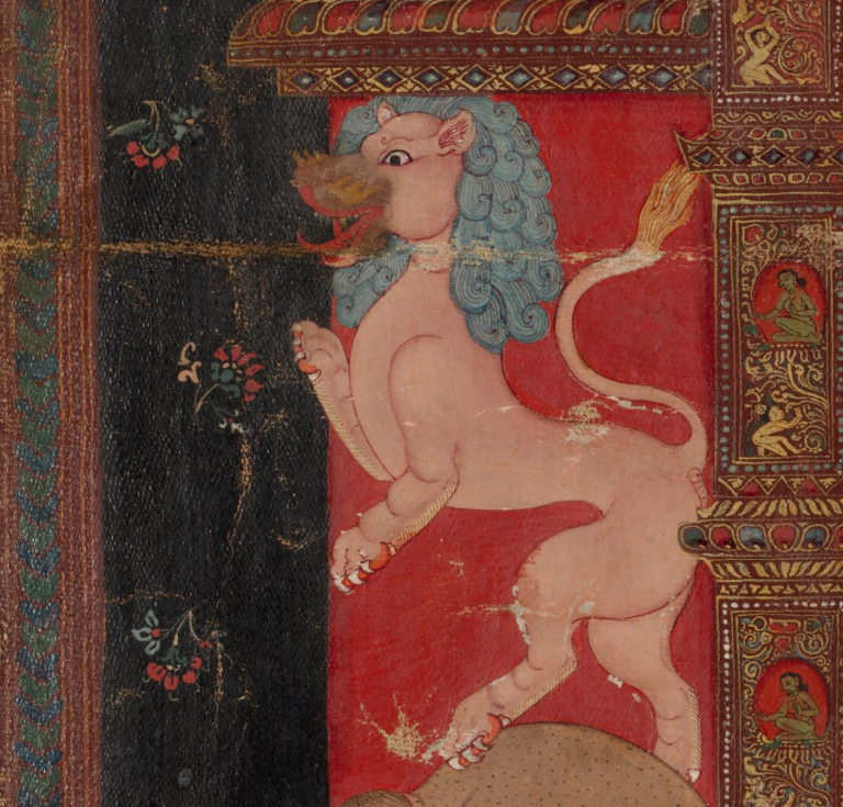 《洛阳伽蓝记》中便记有:“六牙白象负释迦在虚空中……此象常出群邪狮子导引其前”。