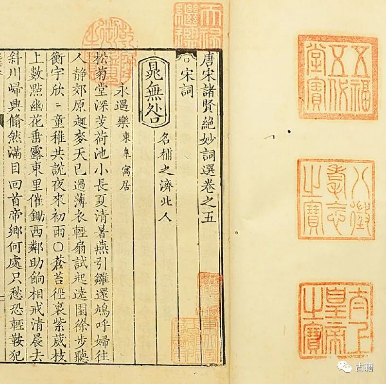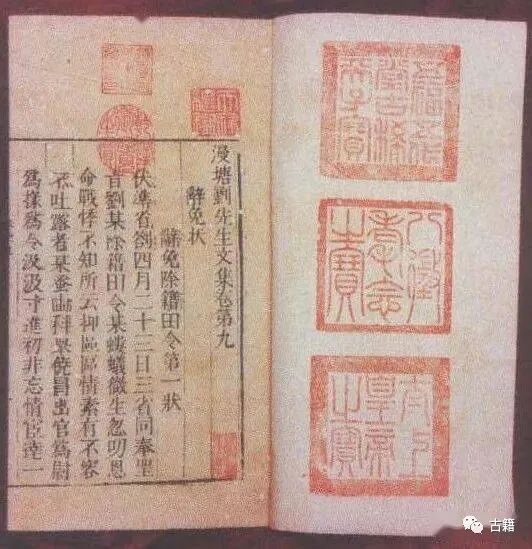 古籍藏书印的钤盖,一般是第一个盖藏书印的收藏者把印盖在从右数第一行下方的空白处;如第一行下方无空白处,则向左移至第二行。第二行盖印的藏书家把印鉴盖在前一位藏书家印鉴上方的空白处,如其上方无空白,则向左移一行,盖于本行下方,依此类推;若其书下方无空白,则移至其页第二行上方的空白处(第一行上方往往为标题所占);若仍无空白,或盖在次页,或盖在书籍印刷字体上,由钤印可见一书的授受递藏轨迹,也可大致推知版本刊刻时限。