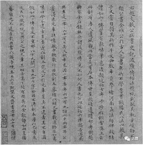 张青甫《清河书画舫》载:赵文敏有《史记》真本,公自跋云:“此宋人写本十帙,不知的出谁手,而笔法精劲,校雠不苟。予为购而藏之。若夫楮墨之精,藏弆之善,犹馀事耳。大德改元嘉平八日题。”此册为公书汲长孺传,后题:“延祐桼年九月十三日手钞于松雪斋。此刻有唐人遗风,予仿佛得其笔意如此。”按公《史记》跋语虽未明言宋椠本,以鄙意度之,宋椠善本多仿欧阳率更体,所谓“笔法精劲”与“有唐人遗风”者,公所仿佛,其殆此本欤?大德元年在延祐七年前二十四年,则宋本之藏松雪斋久矣。(据影印墨迹;见图3)
