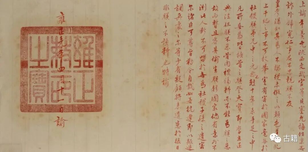 雍正十三年乙卯(1735年)颁《雍正皇帝遗诏》散秩大夫公法等来。“奉天承运,皇帝诏曰:……朕蒙皇考……慎选于诸子之中,命朕缵承统绪,绍登大宝,夙夜忧勤,深恐不克负荷……十三年以来,竭虑殚心,朝乾夕惕……至今日虽自信无负,而志愿未竟,不无微撼。宝亲王皇四子弘历……圣祖皇考于诸孙之中,最为钟爱,抚养宫中,恩逾长格。雍正元年八月间,朕于乾清宫,召诸王满汉大臣入见,面谕以建储一事,亲书谕旨,加以密封,收藏以乾清宫最高处,即立弘历为皇太子之旨也。其后仍封亲王者,盖令各位藩封,谙习政事以增广见识。今即遭大事,着继朕登基,即皇帝位……弘历……与亲王弘昼同气至亲,实为一体,优当诚心友爱,休戚相关……大学士张廷玉气量纯全,抒诚供职,其纂修《圣祖仁皇帝实录》,宣力独多,每年遵旨缮写上谕,悉能详达朕意。……大学士鄂尔泰……此二人者,朕可保其始终不渝,将来二臣著配享太庙,以昭恩礼……持服二十七日释服……”