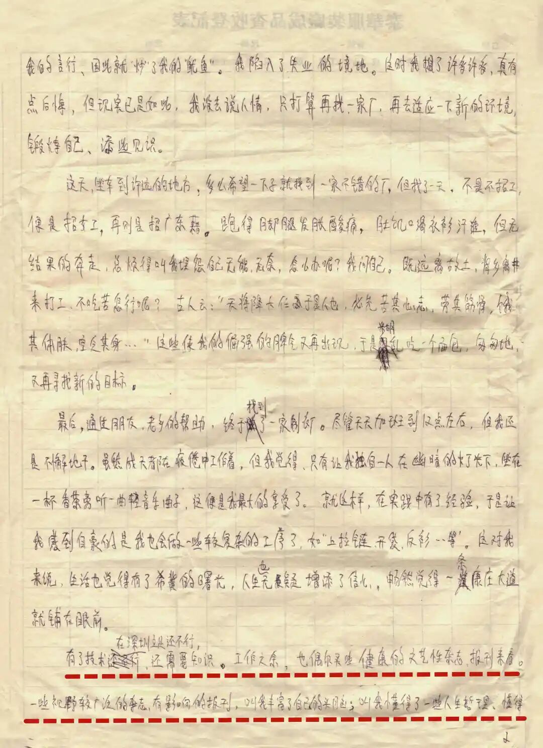 “有了技术在深圳立足还不行,还需要知识……今后的社会有能力则上,则有饭吃,则能立足于社会;也叫我明白有了技术与知识文化,才有可能会顺应潮流,在人类和平竞争中立足永存。因而,这些鞭策着我向前发展,所以我从未放弃过学习的机会。”