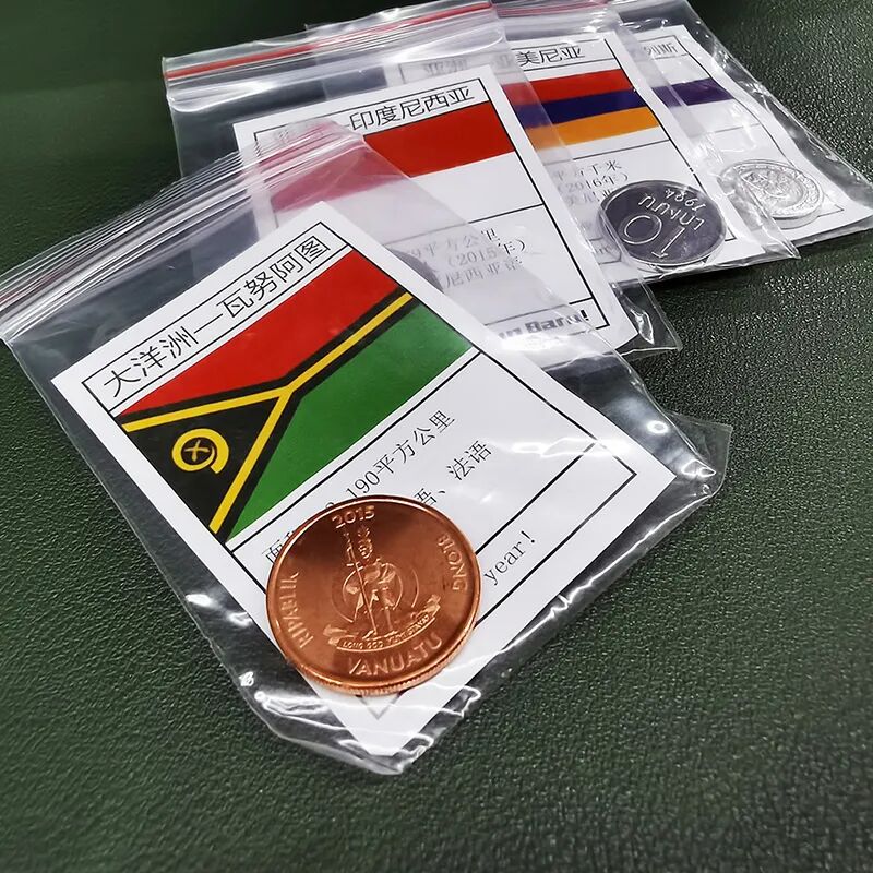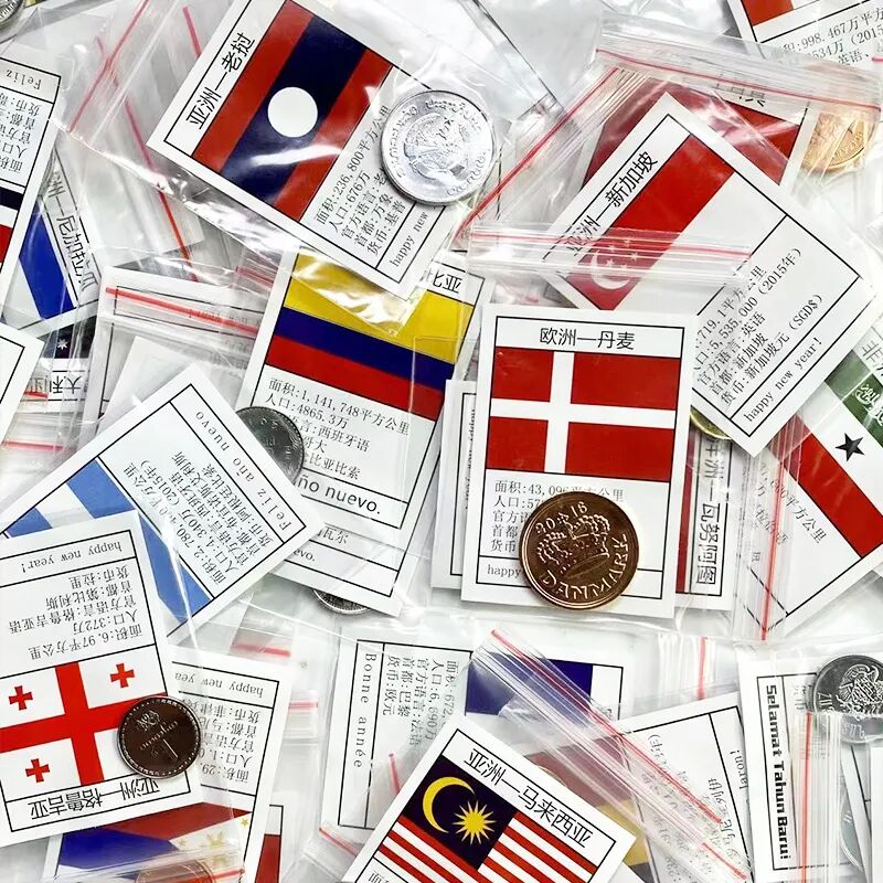 给大家看看其中一些硬币,真的很不错!不仅如此,每一枚硬币都是独立包装,还带旗帜、国家地区等的对应文字介绍,在家就能看世界。
