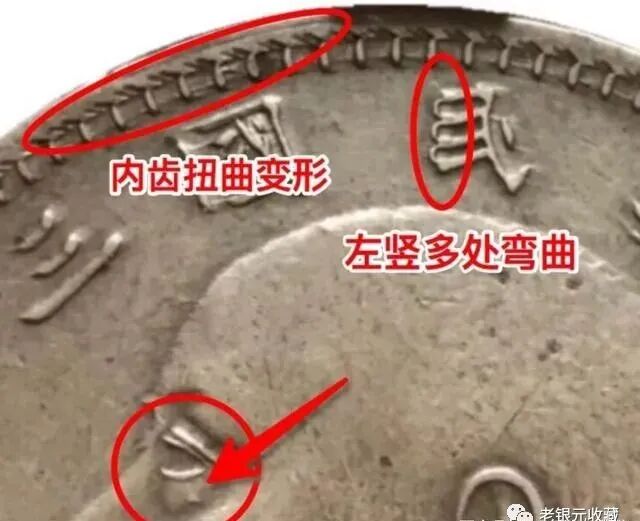 甘肃曲笔民版式特征:正面袁像上“民”字的左竖呈多处弯曲状,而且弯曲的幅度比较大,与直笔民区别明显,故名“曲笔民”;内齿扭曲变形,有种旋内齿的风格,眼睛下有流银形成的小圆点(不一定全有哦);根据袁像眼睛下有无流银小圆点可以分为曲笔民眼下点和曲笔民眼下无点两种,这一版的划分是模具所致,收藏时并没有过于因此而划分版别,大家了解就好;曲笔民根据“民”字左竖的弯曲程度可以分为大曲笔民和小曲笔民两种,而大曲笔民凭借独到的笔画深的泉友们喜爱,收藏行情好于小曲笔民版;