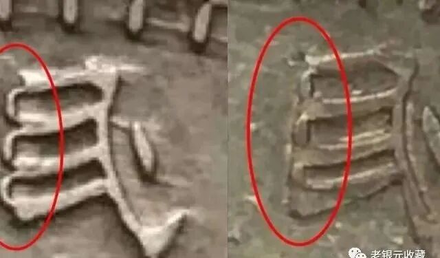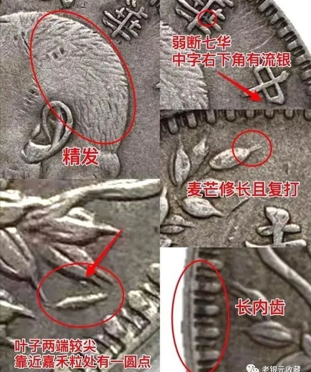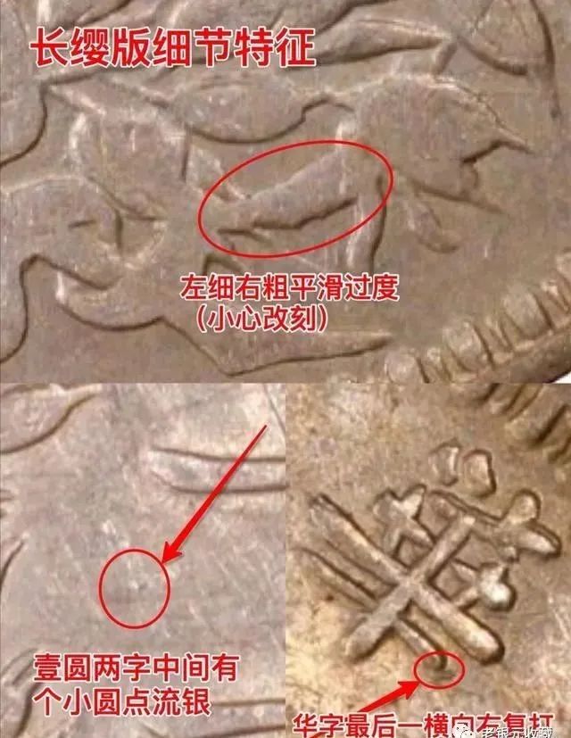 甘肃落叶版特征:背嘉禾面五点钟处多出一片落叶,落叶形状是叶子两端较尖,靠近落叶上面的嘉禾粒下有一圆点,可能是流银;除此之外,袁像的头发必须是精发,“华”字弱断七华,也就是说下图中标出的这一横左横似断没断的感觉;背嘉禾“壹”字上方的嘉禾麦芒袖长分叉,复打的效果,整个银币是长内齿,以上是落叶版的特征,泉友们对比图片了解一下;甘肃落叶版特征明显,收藏市场上有很多改刻的版本,大家一定要结合它的细节特征,综合判断,辨别它的真伪;甘肃长缨版特征:背嘉禾面的五点钟处多出一条缨带与嘉禾相连,缨带是左边细右边粗,整体比较平滑,并没有可以改刻的感觉,“壹圆”二字中间有一个小圆点流银,正面袁像上“华”字左后一横有向右复打的现象;长缨版的缨带也有粗细之分,有细长缨、中长缨和粗长缨三种,其中细长缨最少见,粗长缨是最为多见的版,大家在收藏时要多小心改刻版;根据袁像眼皮的不同可以分为普通眼皮长缨版和五眼皮长缨版,在这里不多做解释;讲到这里,相信大家对甘肃三剑客有了更近一步的了解,银元收藏除了注重品相意外,还要多了解版别,无论是袁大头银元、孙小头银币或者是龙洋,多了解版别对我们辨别银元的真伪有很大帮助。