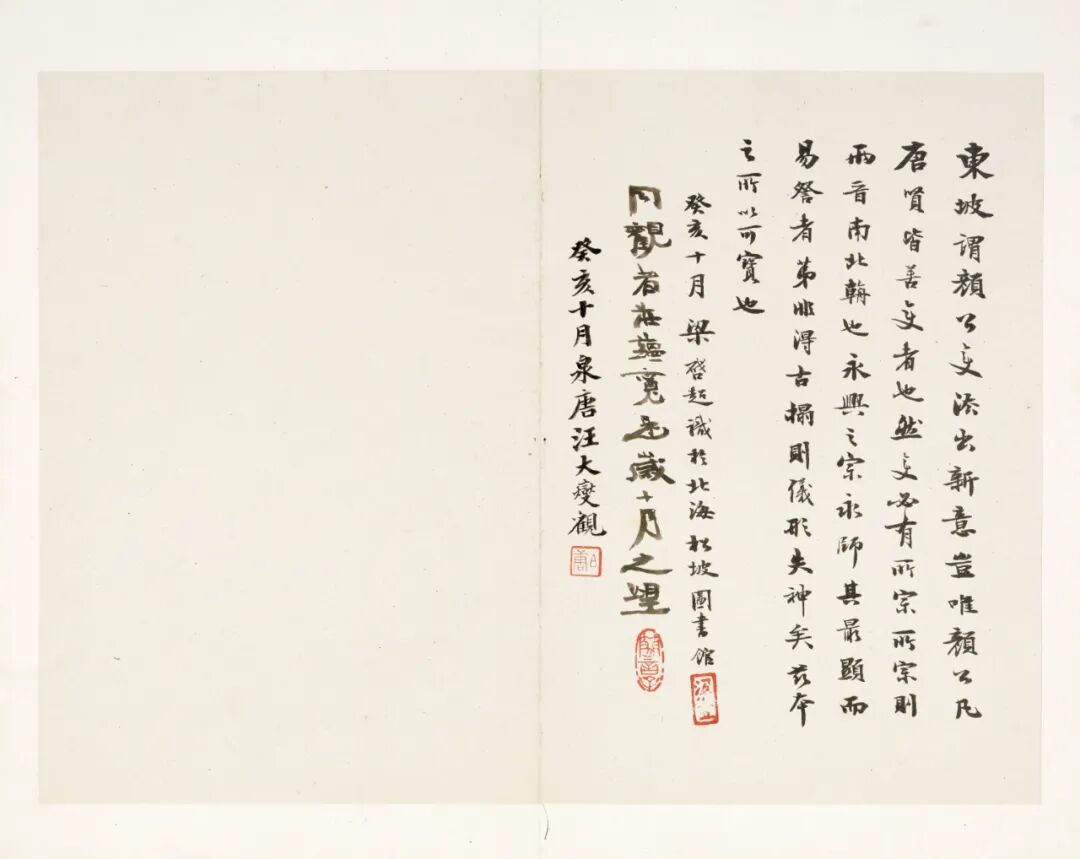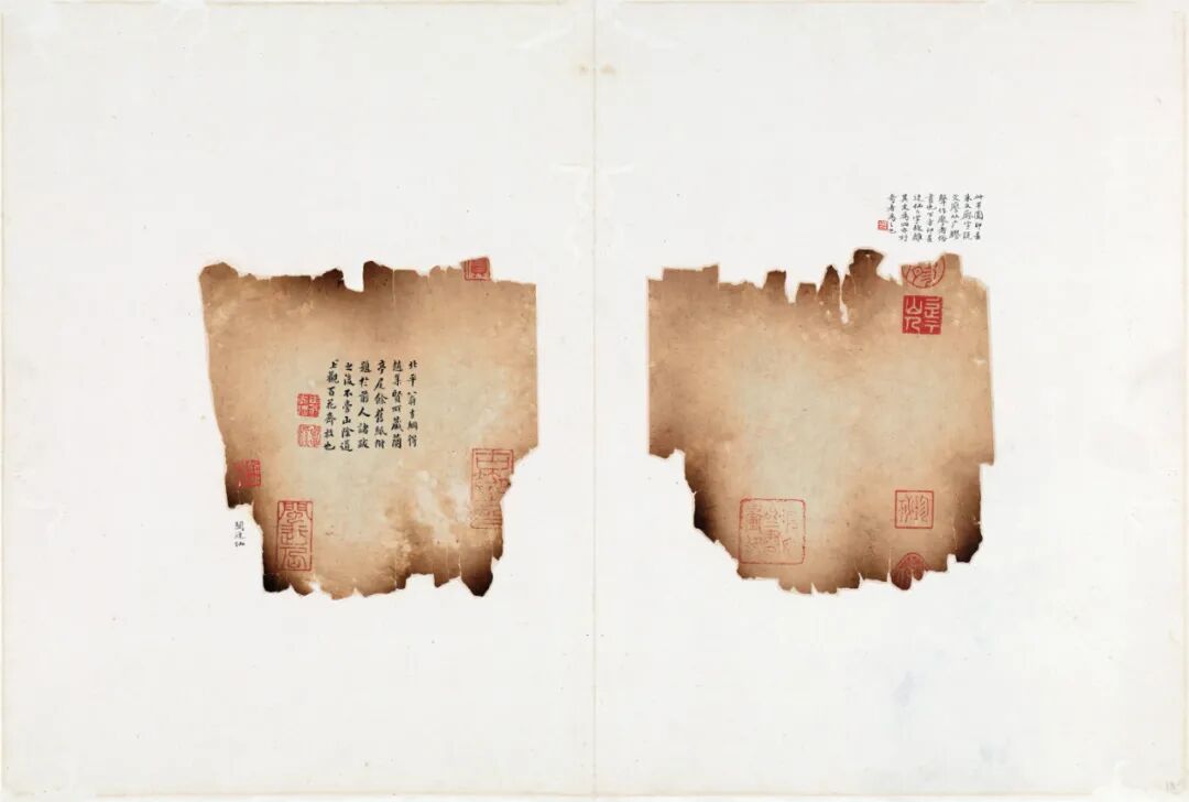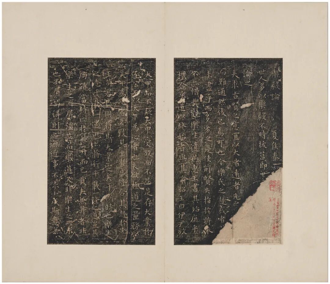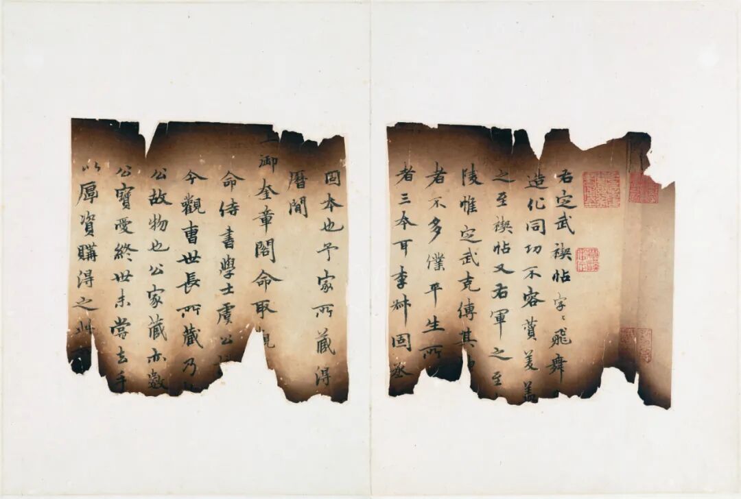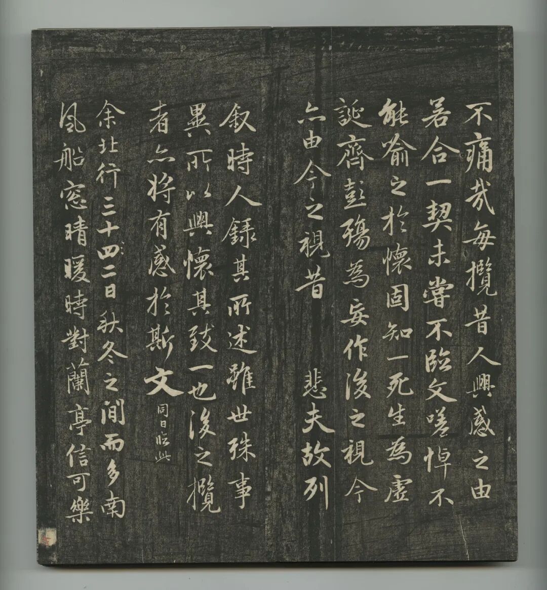 日本东京国立博物馆收藏一册宋拓五字已损《定武兰亭》,题为“兰亭独孤本并跋残字”。拓本连题跋共二十一开,册高三十三点二厘米,宽二十四点六厘米。这件独孤本与今藏台北“故宫博物院”的柯九思本,是目前传世仅存的定武原石真本,在书史上赫赫有名,南宋末俞松撰《兰亭续考》即已记载,清《大观录》《墨缘汇观》《平生壮观》《式古堂书画汇考》等均有著录,翁方纲《苏米斋兰亭考》辟有专章考述。![]()