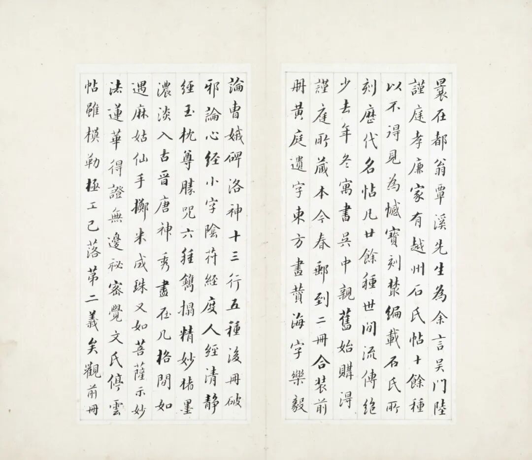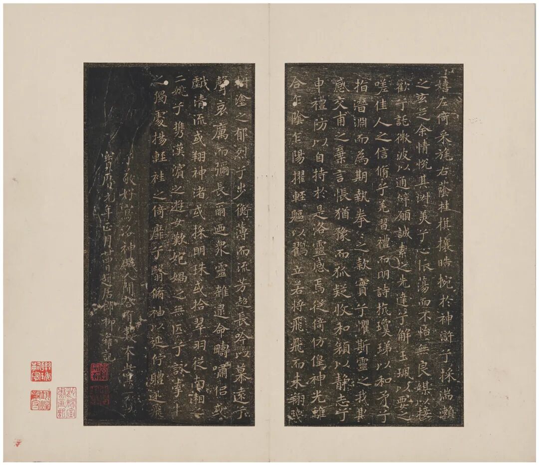 石邦哲藏书之外,又于绍兴年间将家藏法书名迹摹刻入石,名《博古堂帖》,世称《越州石氏帖》。南宋陈思《宝刻丛编》卷十三中有《石氏所刻历代名帖》,是关于此帖情况的最早记载。据之可知,该帖汇刻晋唐法书二十七种,其中小楷多达十六种,摹刻十分精善,其中《乐毅论》海字本传为摹自北宋学士高绅家藏刻石,《黄庭经》为火后残石本,而多种唐人名家小字,均为他处所未见,成为后世晋唐小楷流传的重要源头。由于原石已佚,仅有零星拓本传世。至明代,文徵明、文彭父子刊刻的《停云馆法书》是刻帖中之翘楚,尤以第一卷晋唐小楷为世所重,除小字《麻姑仙坛记》取南城本外,其余皆以宋拓越州石氏本摹勒。也是从明代开始,就有好事者取文氏所刻停云馆本,或用所谓宋纸旧墨,或作隔麻,或重新翻刻,伪充宋拓。而真正的宋拓《越州石氏帖》,传世仅知三种:其一为临川李氏旧藏小楷十一种,今藏日本东京国立博物馆;其二为《柳跋洛神赋十三行》单本,今藏私人处;其三为《颜柳白米四家帖》,今藏中国国家博物馆。三种之中,东京国立博物馆所藏因其内容纯为小楷,出版最早、最多,影响最广,是宋刻宋拓法帖的典型。![]()