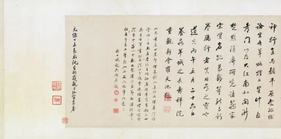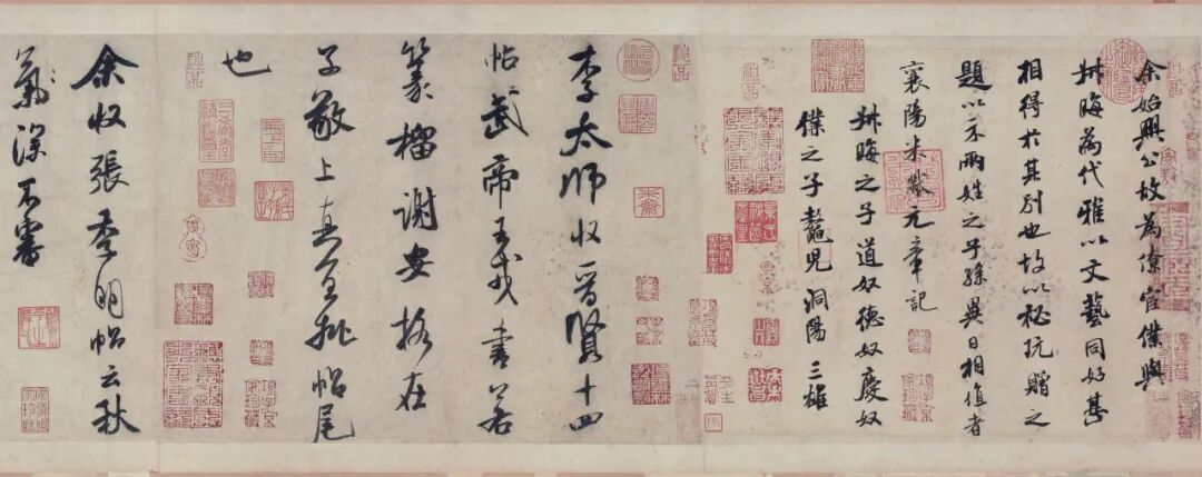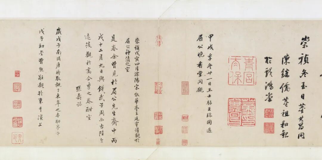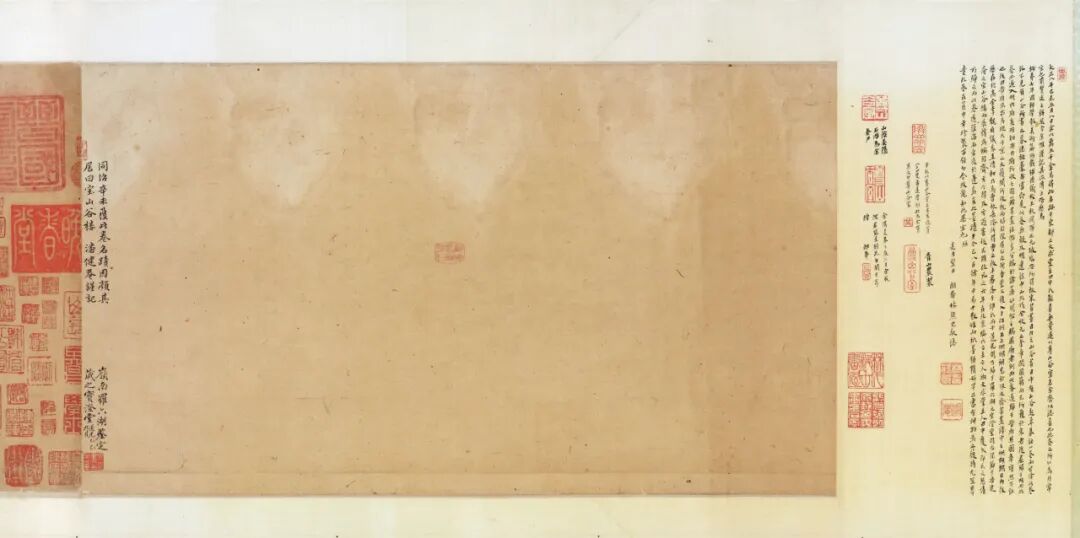 据诸家著录及卷中之鉴藏印,其明代至今之大致递藏为:明洪武内府(卷首“典礼纪察司印”半印“司印”,存疑)→不详→项元汴→盛念修(见汪氏《珊瑚网》)→清梁清标(蕉林)→安岐→乾隆内府(见卷中诸鉴藏玺印)→嘉庆内府(见卷首题签)→庆郡王永璘(见卷首“庆郡王宝藏书画章”)→不详→景其濬(剑泉)→不详→原田悟朗(博文堂)→阿部房次郎(爽籁馆)→阿部孝次郎→东京帝室博物馆(日本东京国立博物馆)。