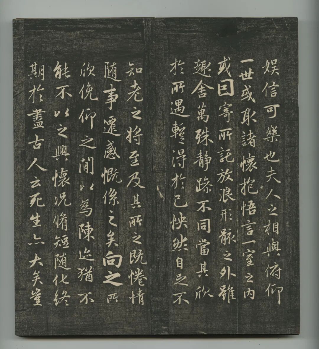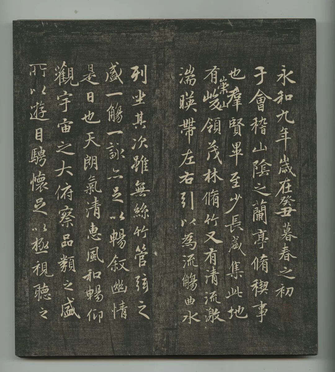 至北宋庆历时,李学究在真定发现一块兰亭刻石,传为以唐代欧阳询临本摹刻,五代末契丹人入汴得之,辇石北去,遗弃在此。因北宋当地驻有义武军,避宋太宗讳改名定武,故此刻石被称为《定武兰亭》。后薛向为统帅,将原石献于天府,其子绍彭又翻刻一本,并将原石凿损“湍、流、带、右、天”五字,成为判别版本的重要依据,另有九字损者,更在五字之前。由于唐摹本稀少,北宋人始重定武,至南宋高宗时期达到顶峰,几欲凌驾所有兰亭版本之上。定武刻石入内府后,消失于靖康之乱。原石拓本在宋时即已难求,故翻刻极夥,南宋桑世昌《兰亭考》、俞松《兰亭续考》记载了当时流传拓本及翻刻情况。至元代,如赵孟頫、柯九思等书画鉴藏大家,所见真本亦不过三四。