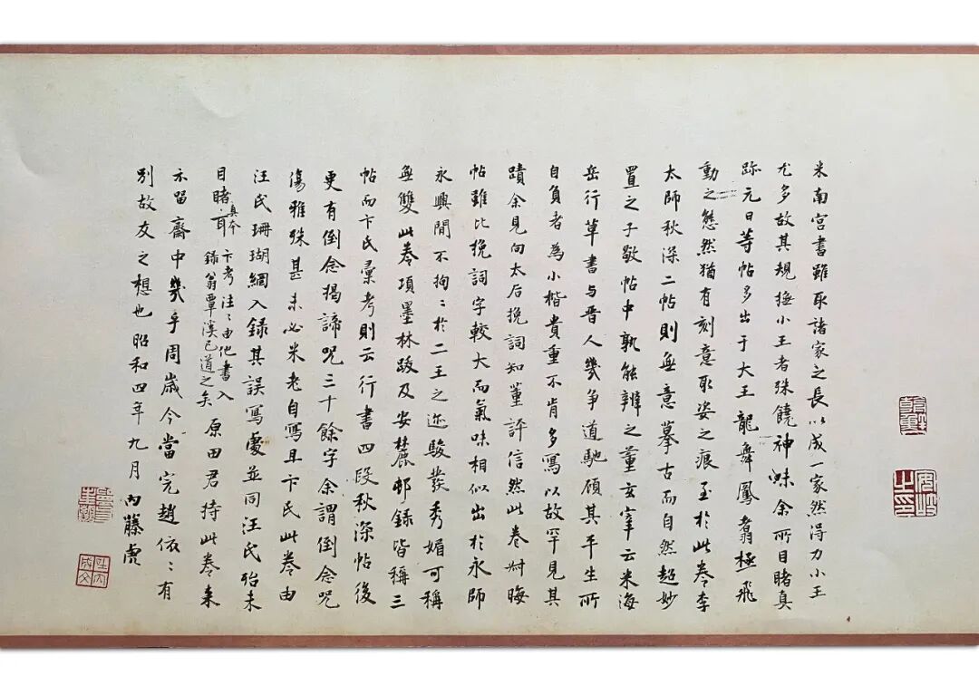 时人初学书,多从楷入,以唐碑为范,用笔匠气呆板,毫无节奏可言,不得其用笔要领者比比皆是,何故?不窥墨迹之妙,安知刀镌手写之异乎?再观张即之此作,虽为楷书,但融合行书笔意,笔锋缭绕,常带游丝,笔势往来尽现于纸,使人感觉气息连贯,节奏鲜明,这更加帮助了以行书笔意入楷方为正道。故《张樗寮华严经真迹》用笔之法可警世人,气象可供参考,是当下学习楷书的上佳模板。