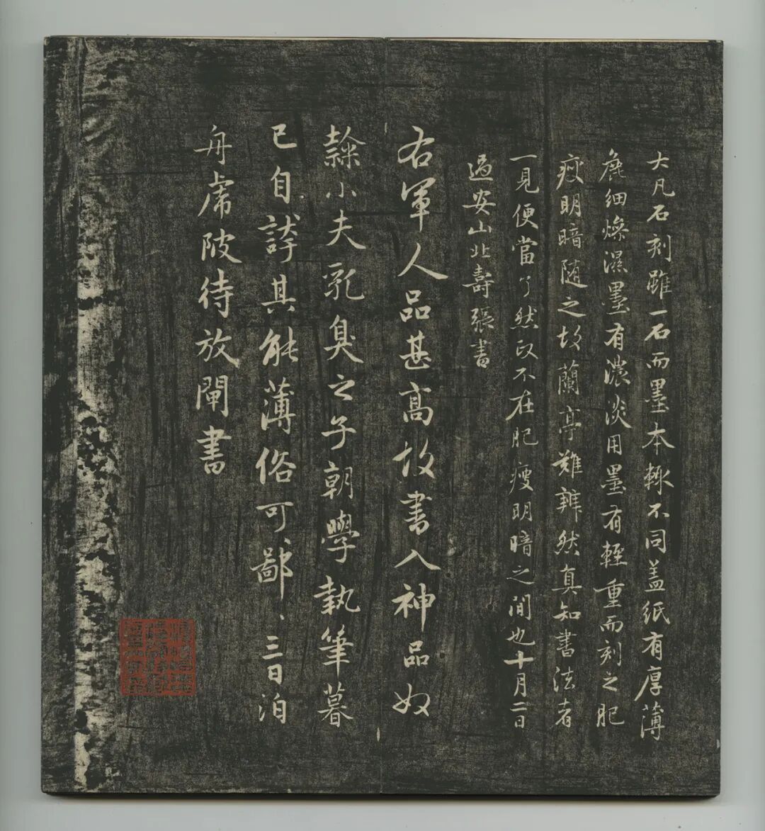 北宋大观三年(1109)薛嗣昌据长安崔氏所藏真迹摹刻上石,分列两面刻。前六列,后二列。计二十七行,行十字。末刻薛嗣昌跋文,左下刻“侄方纲摹”,又刻“李寿永、寿明刊”等字。原刻石尚存西安碑林博物馆,世称“关中本”或“陕西本”。另有明董其昌“戏鸿堂法帖本”、清初刻“宝墨轩本”等,其中刻本以“关中本”为优。![]()