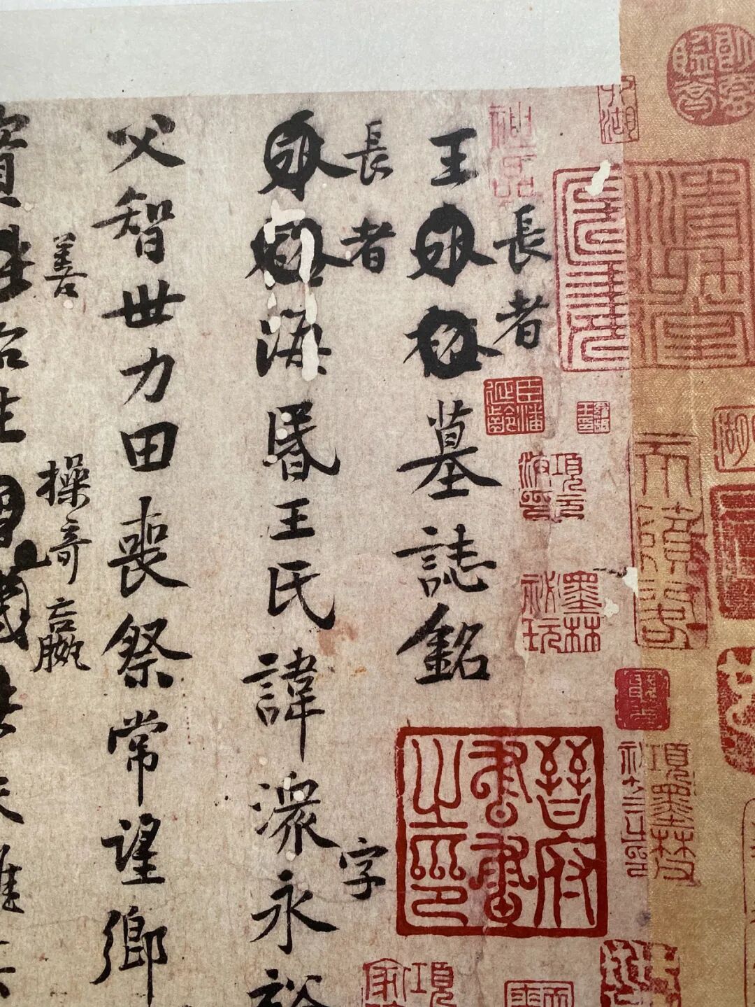 《王长者墓志铭》稿,凡二十二行,行十四五字不等。全稿文字涂改、增补四十余处,或非定稿本。王长者名潨,字永裕,海昏(今江西永修县)人。善经营,雄富于乡,并筑馆藏书,后将家业分于诸子,遂徜徉世外,游居于赣中名寺。王氏卒于元祐丙寅(1086)正月,享年六十有二,落葬于“十月某甲子”。王氏长子王楙娶妻李氏,与黄庭坚家族有姻亲(远亲)关系,王楙请黄庭坚撰墓志铭,故无法推辞。因人情所托,黄庭坚或许对王氏家族未必十分了解,因此字字斟酌,涂抹增删。此墓志铭稿无署款及年月,因其中有“元祐丙寅正月辛卯终焉”与“楙等遂以其十月某甲子,奉窀穸如初志”,今人徐邦达先生《古书画过眼要录》中,定此墓志铭为元祐丙寅所作,时山谷四十二岁。