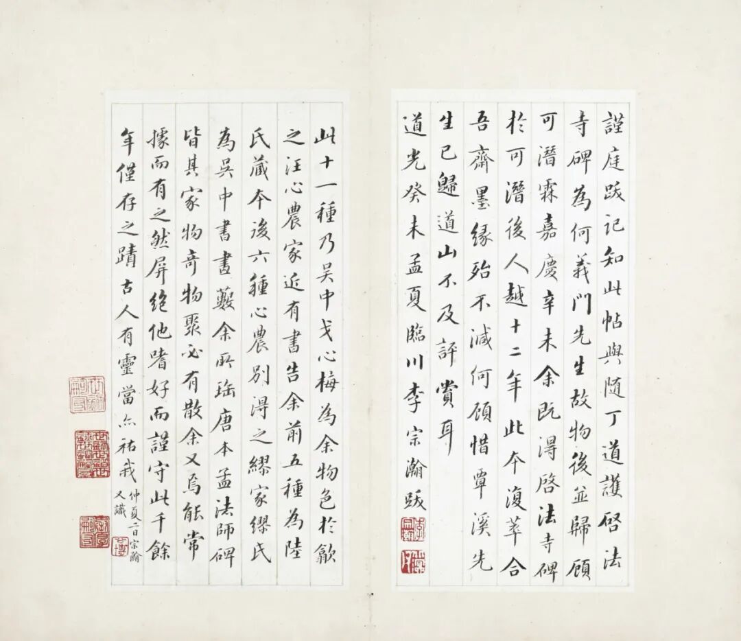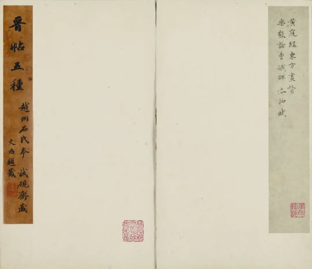 此小楷十一种,宋锦面板,蝴蝶装,册高三十六点二厘米,宽二十一厘米。清人李宗瀚题外签“宋拓晋唐楷法,越州石氏帖之十一种,静娱室珍秘”,内签为王文治为汪穀(字琴田,号心农)所题,文为“晋帖五种,越州石氏本,试砚斋藏,文治题签”,拓片题跋共计三十五开。此本原为两册,晋帖五种(《黄庭经》《东方画赞》《乐毅论》《曹娥碑》《洛神赋》),后有王文治三跋、陆恭(字孟庄,号谨庭)题跋。唐人楷帖六种(《破邪论》《心经》《尊胜陀罗尼》《常清静经》《度人经》《阴符经》),后有李宗瀚二跋、翁方纲致李宗瀚信札两件、邵福瀛(字海父,邵松年之子)题跋。据陆、李跋,前半册原为何焯(字屺瞻,号义门)旧藏,后归顾霖(字雨时,号可潜、不缁道人),再归顾孙婿陆恭;后半册原为缪曰藻(字文子)旧藏,后汪穀分别从陆、缪两家得到此二册,合而为一,继经戈心梅手归李宗瀚。册中所附翁方纲两札涉及翁向李指点购帖门径,可见乾嘉金石藏家交易的情状。又自李宗瀚、李联琇传至李翊煌,于晚清光绪十九年(1893)交由上海蜚英馆石印出版,成为著名的“临川李氏十宝”之一,也是影印技术传入中国之后,最早问世的一批碑帖善本之一。