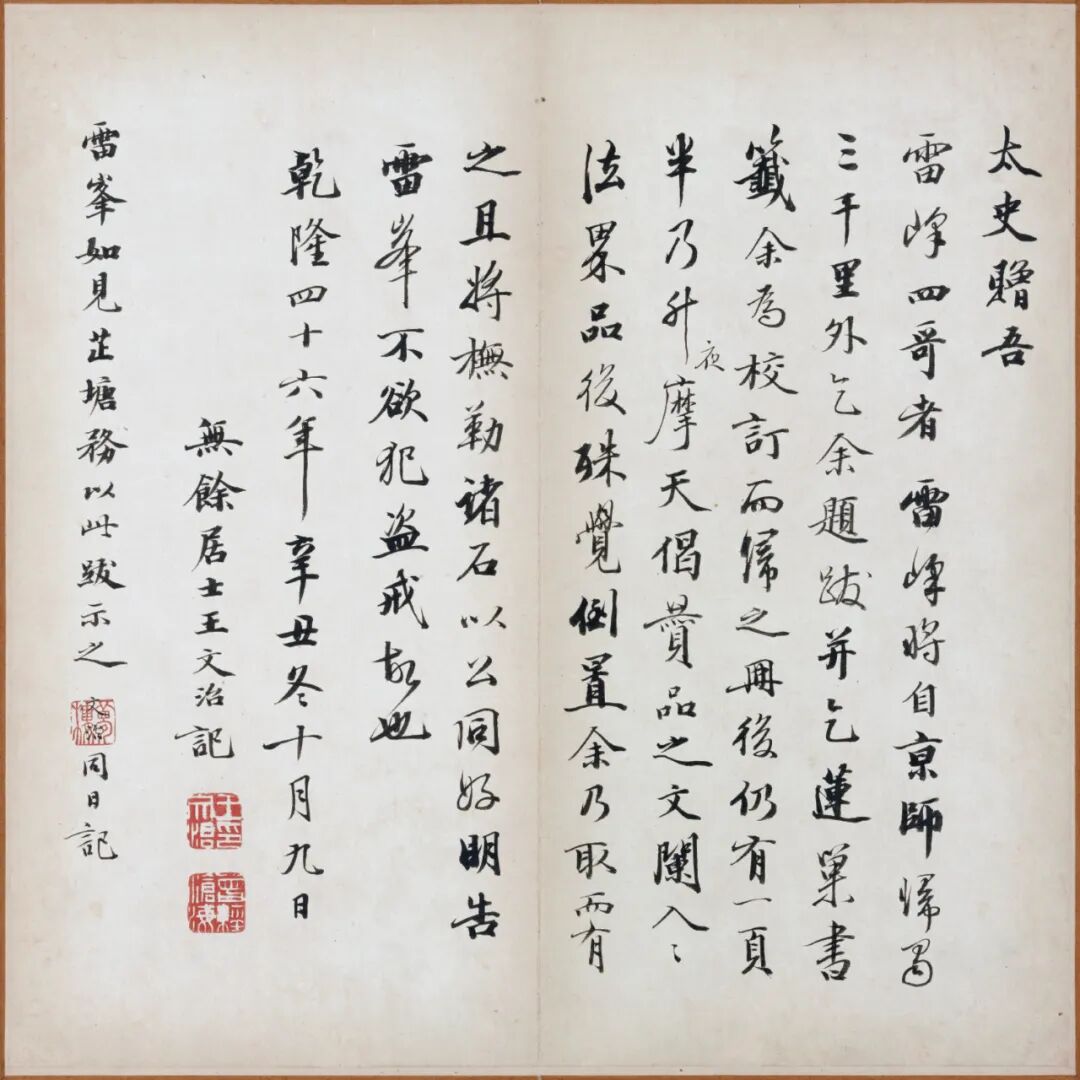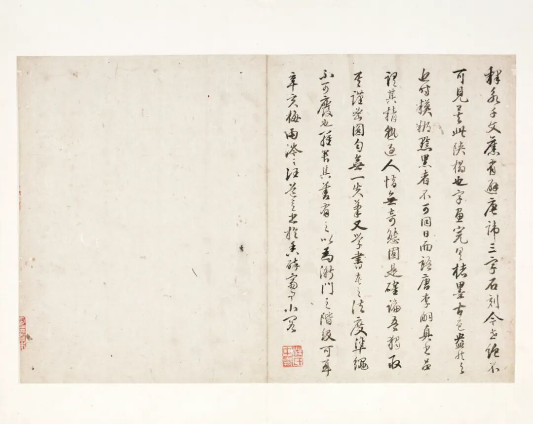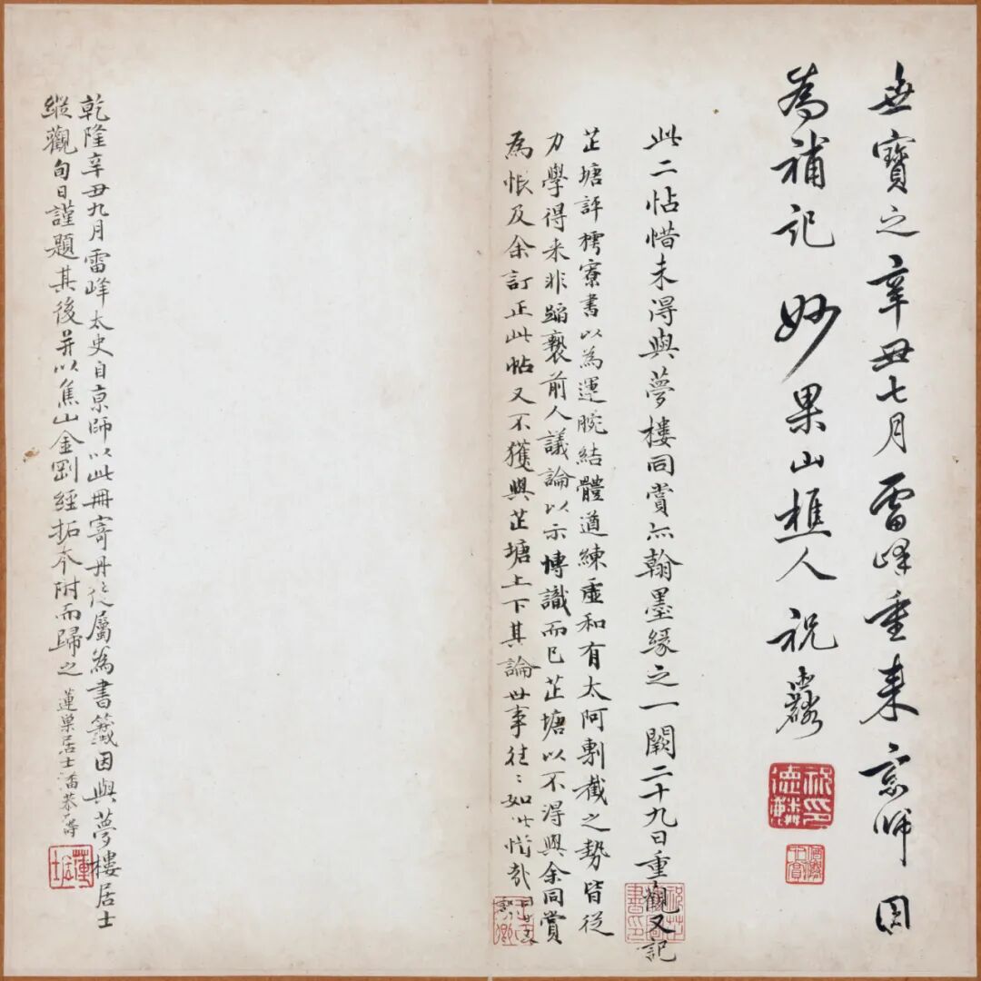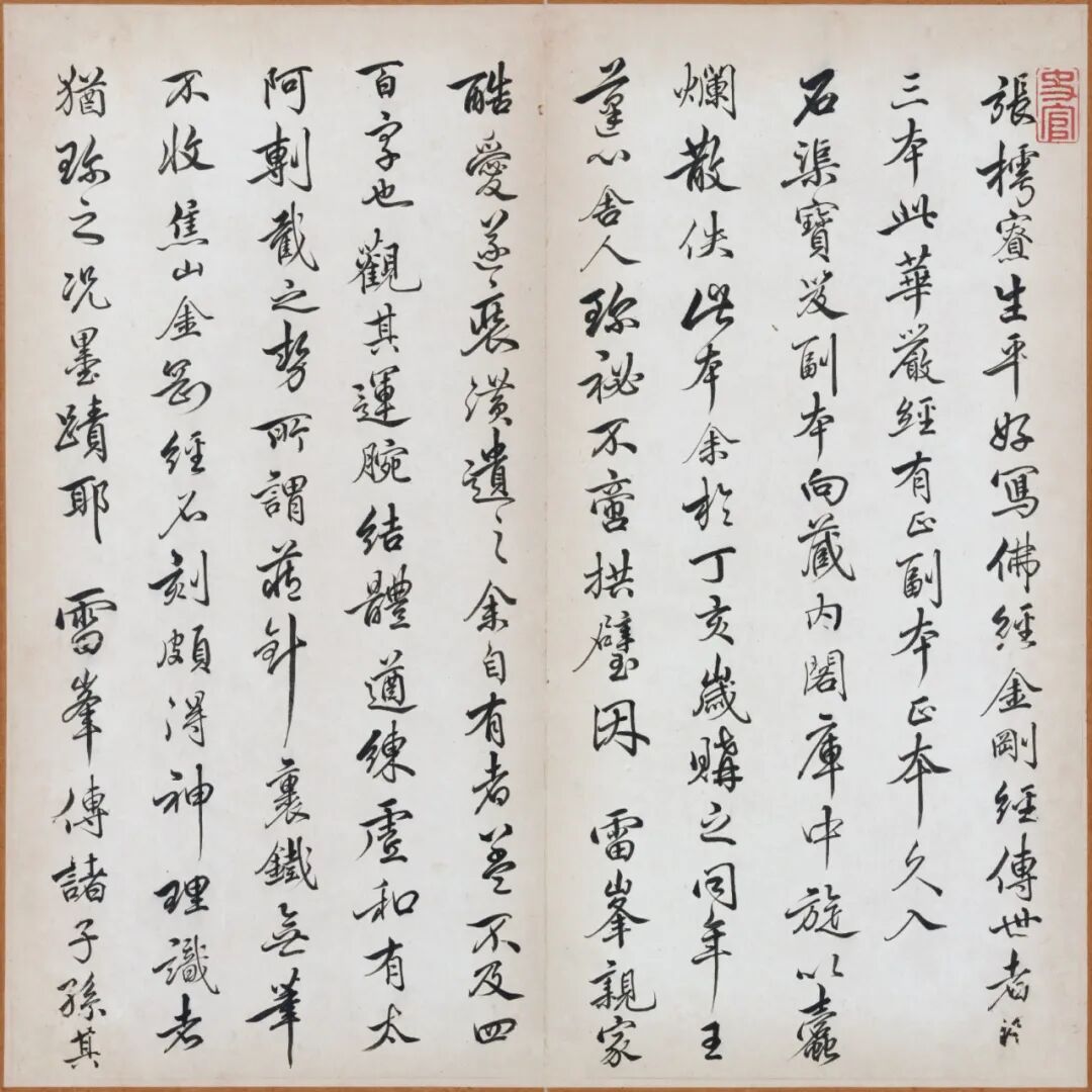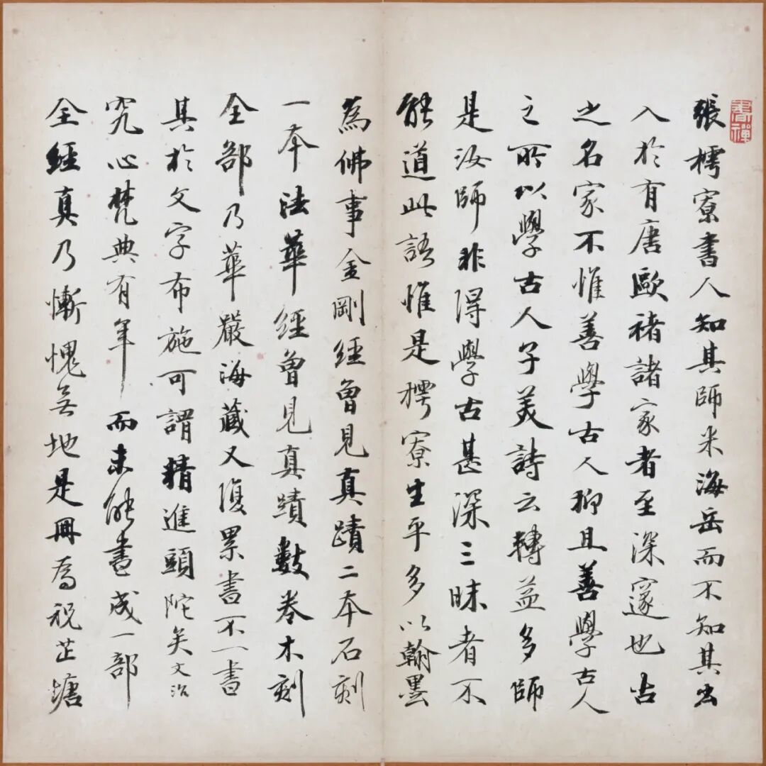 清乾隆年间祝德麟(字芷塘)旧藏张即之书《大方广佛华严经卷第六十四》残本册页,全十六纸,后第十二至十六纸为后人补书,外有清末汪鸣銮题签“张樗寮华严经真迹 匋斋藏 郋亭题”。帖首四页为王文治跋文(乾隆四十六年,1781),帖末有祝德麟、王文治、潘恭寿、嵩龄等十五家题跋。此作结体整严,笔力劲秀,沉稳雄浑,是其传世小楷的佳作。是册后经杨未禅、端方递藏,后流入日本,现藏于日本东京国立博物馆。![]()