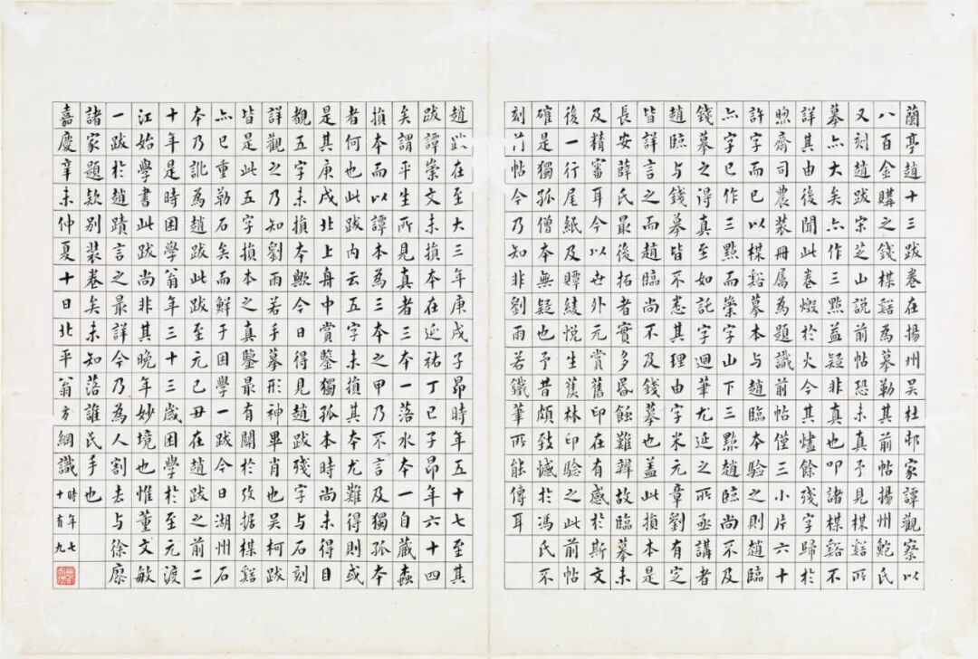 《真草千字文》,真草二体,乃智永传世代表作,也是中国书法史上留传千古的名迹。其法度谨严,一笔不苟,运笔精熟,飘逸之中犹存古意,其书温润秀劲兼而有之。宋米芾《海岳名言》评曰:“智永临《集千文》,秀润圆劲,八面具备。”又如苏轼所评:“精能之至,反造疏淡。”