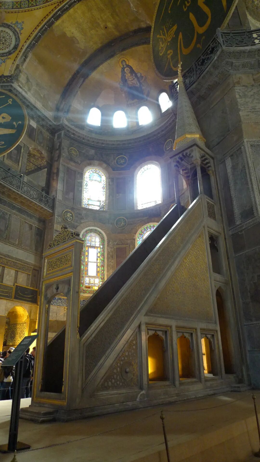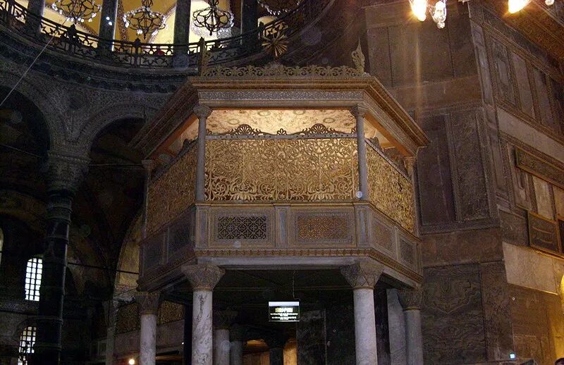 ▲圣索菲亚教堂的南侧与东侧,从帝国大门可以看到托普卡帕宫自穆罕默德二世开始,历任苏丹不断地为圣索菲亚增加伊斯兰元素:四根高耸的宣礼塔先后拔地而起;米海拉卜出现在原有祭坛的位置上;苏莱曼一世16世纪征战匈牙利后带回一对巨型蜡烛,摆放在米海拉卜的旁边。![]()