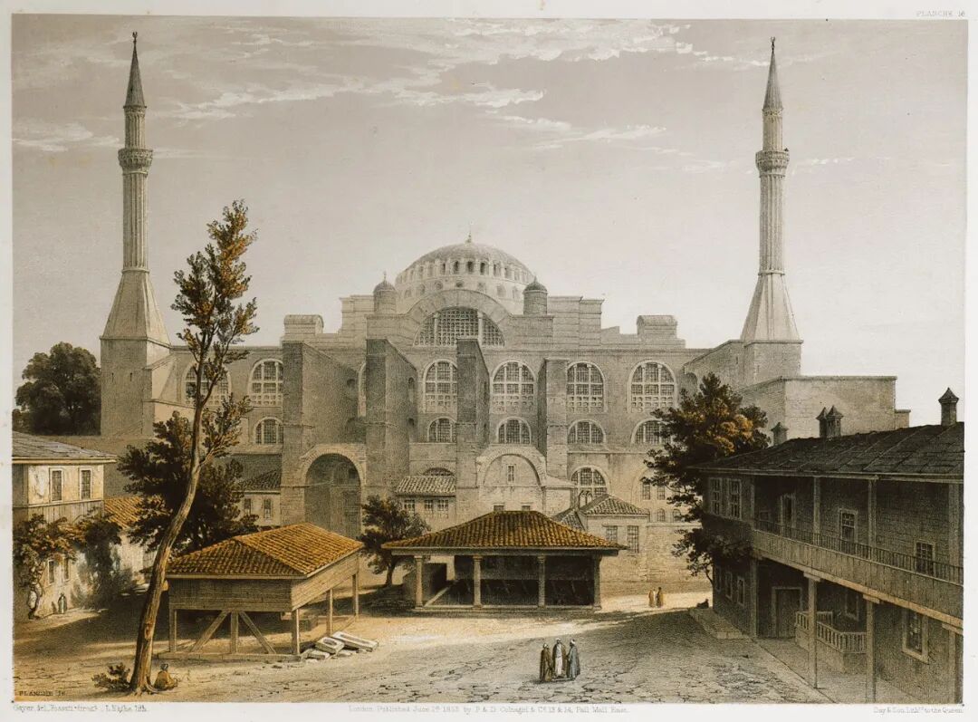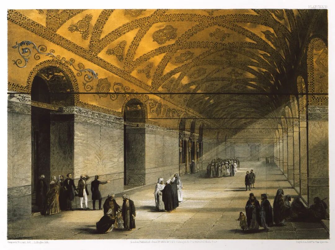 ▲[瑞士]加斯帕雷·福萨蒂&[比]罗伊斯·哈格《圣索菲亚大教堂中殿与后殿》,1852 年,石版画,35.5 x26.6 cm遮盖马赛克这一过程在改造教堂的最初几个世纪内一直在持续,直到圣殿变得空空荡荡,但也显露出难得的庄严肃穆。![]()