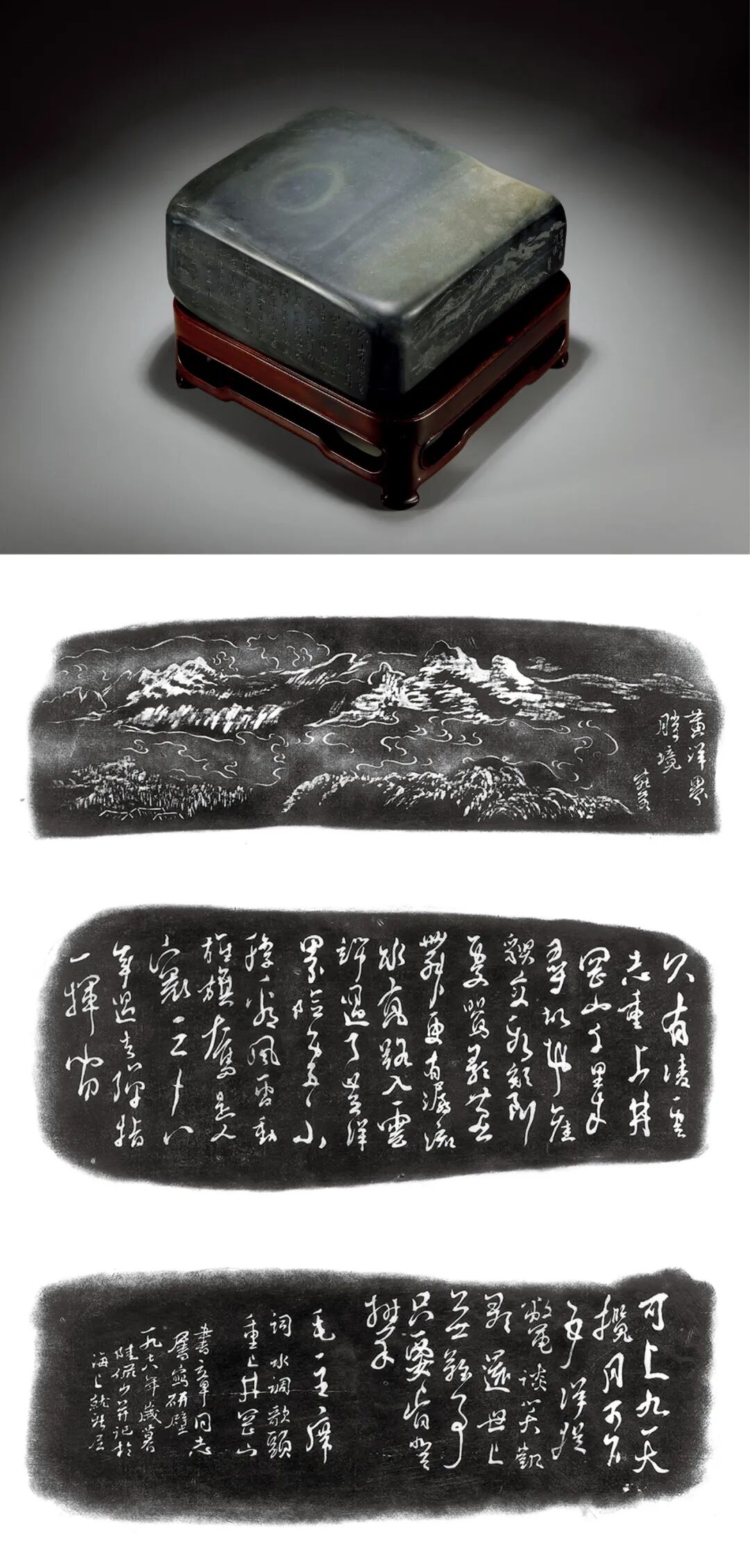 说明:lot2865-lot2869为白书章作品专题。白书章为新四军的一名革命战士,解放后任上海市卫生局首任党委书记,上海市园林局党委书记,上海市文管会委员。擅长篆刻制砚,工作之余,热衷书画收藏,与林风眠、来楚生、唐云、陆俨少、谢稚柳、钱镜塘等众多书画名家、鉴藏家相与往返,结为好友。此砚为1978年白书章属陆俨少于歙砚砚壁作“黄洋界胜景”并书毛主席诗《水调歌头·重上井冈山》。陆俨少所绘黄洋界胜景,群山起伏,迷雾妖娆和密云翻滚,白茫茫如同汪洋大海,呈现出群山奔涌、白云填谷的气象,蔚为奇观。