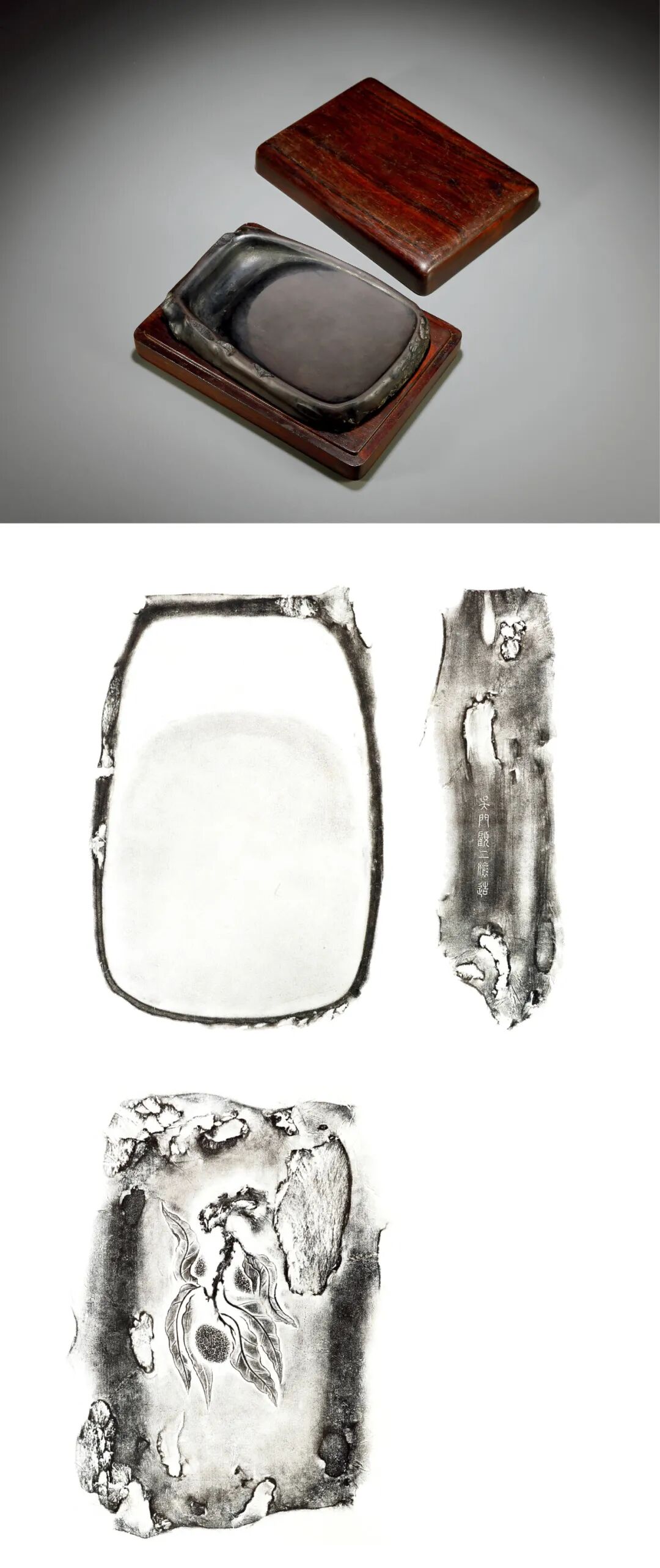 说明:砚为端石所制,形体修长,随形以透雕法作老树虬枝,砚之上端有石眼数枚,借为果实累累,以下垂之大叶为砚堂,上端树干之结疤下凹为砚池,立意精妙,雕工写实传神。砚背有翡翠斑,斑驳如鳞,故题名曰老龙鳞。配紫檀木雕松纹砚盒。