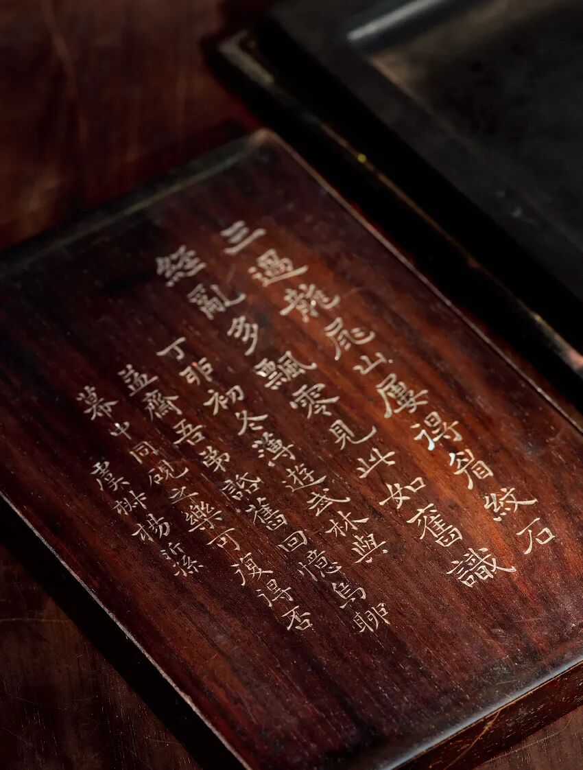 砚盒铭文:三过龙尾山,屡得眉纹石,经乱多飘零,见此如旧识。丁卯初冬薄游武林,与益斋吾弟话旧,回忆乌聊幕中同砚之乐,可复得否。虞椒杨沂孙。