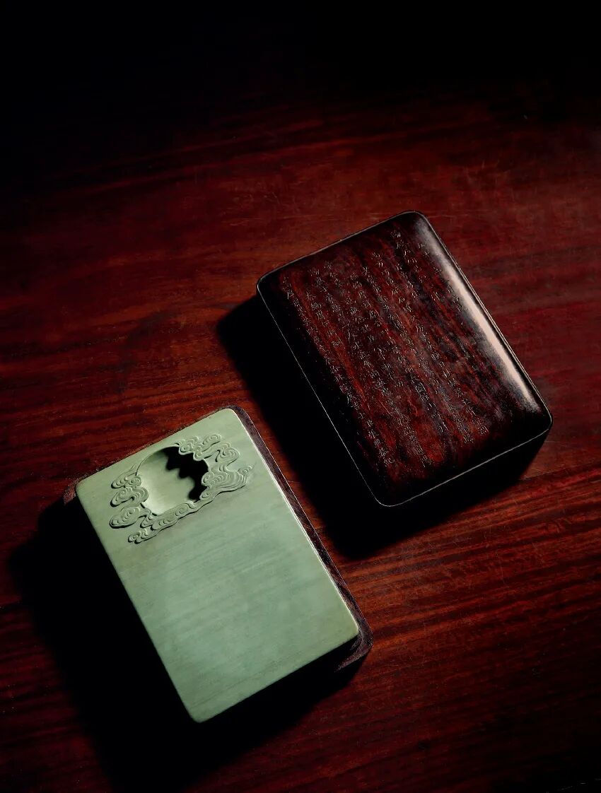 说明:砚为端溪佳石所制,长方,正面磨平,上部有明媚石眼一枚,灿烂如明月在空。砚背雕云纹,雕刻文雅,与正面之石眼呼应,故题名曰云月砚。配紫檀木砚盒及砚箱。