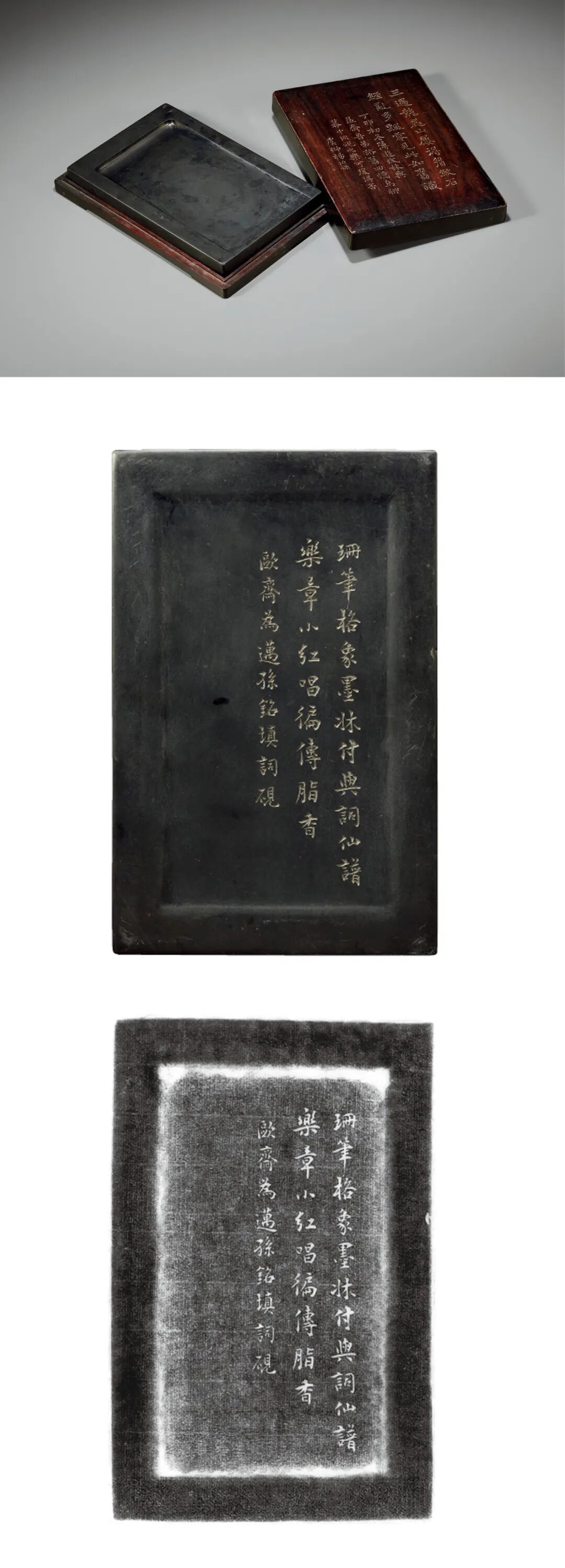 2. 砚为歙石,方正端庄,作长方淌池式,砚池轻浅,线条挺拔。石色青灰,质地坚润,保存完好,品相极佳。此砚原为周炼霞故物,周炼霞为近现代海上著名女词人,此砚题名填词砚,当是周炼霞宝爱之物。配杨沂孙铭红木砚盒。