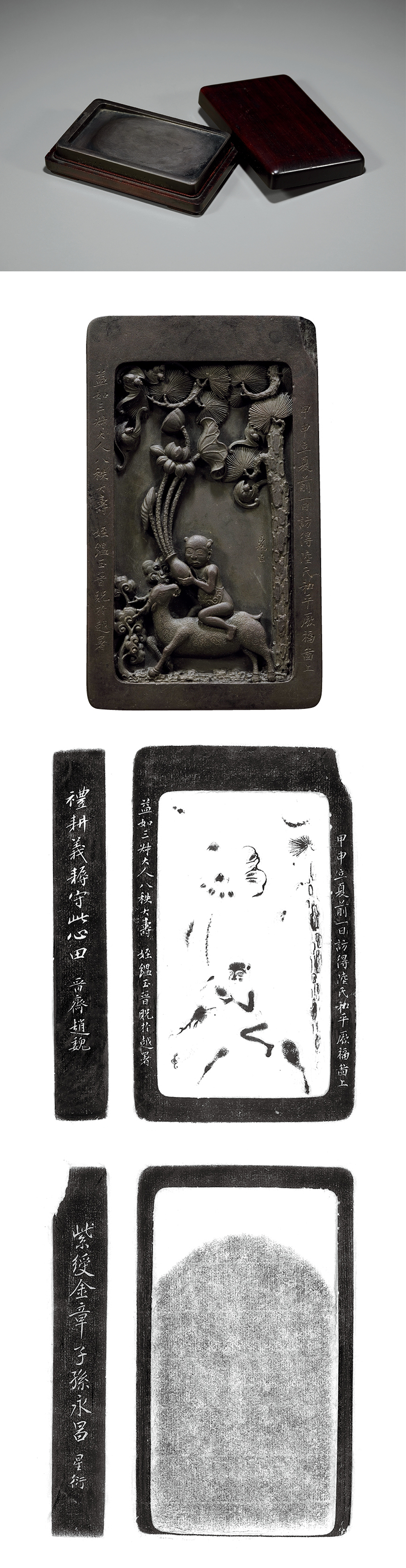 说明:砚为端石,做长方淌池式,简洁大方。砚背覆手内浮雕和平厥福图,童子骑鹿,手执大瓶,瓶中插荷,寓意和平。两侧饰以长松灵芝,为典型祝寿题材。刻法用高浮雕,较为少见。配红木砚盒。