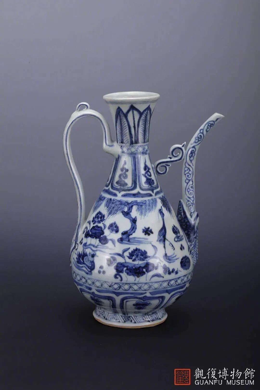 观复博物馆中藏有一只元代的青花莲池鸳鸯纹执壶,此件执壶以玉壶春瓶为主体,撇口细颈,溜肩垂腹,两侧加装鋬与长流,器型饱满流畅。